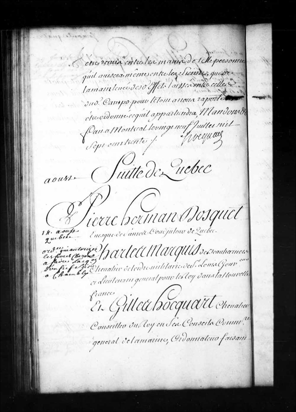 Ordonnance du gouverneur de Beauharnois, du coadjuteur de Québec, Pierre-Hermann Dosquet, et Gilles Hocquart, faisant les fonctions d'intendant, qui autorise les Frères Hospitaliers établis à Montréal sous le nom de Frères Charons à faire l'acquisition de la veuve de François Hertel d'un fief sis à Chambly consistant en une demi-lieue de front sur une lieue de profondeur pour le prix et somme de trois mille deux cent quarante livres, 14 août 1730, Archives nationales à Québec, Fonds Intendants, (03Q,E1,S1,D18,P2209).