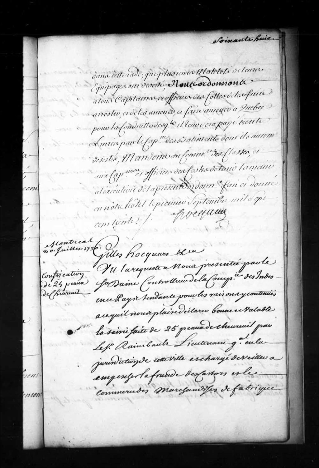 Ordonnance de Gilles Hocquart, faisant les fonctions d'intendant, qui déclare bonne et valable la saisie de vingt-cinq peaux de chevreuil faite par le sieur Raimbault (Raimbaud), lieutenant général de Montréal, sur trois Sauvages (Amérindiens) qui tentaient de les entrer en fraude, et décide qu'elles resteront à la Compagnie des Indes, 20 juillet 1730, Archives nationales à Québec, Fonds Intendants, (03Q,E1,S1,D18,P2212).