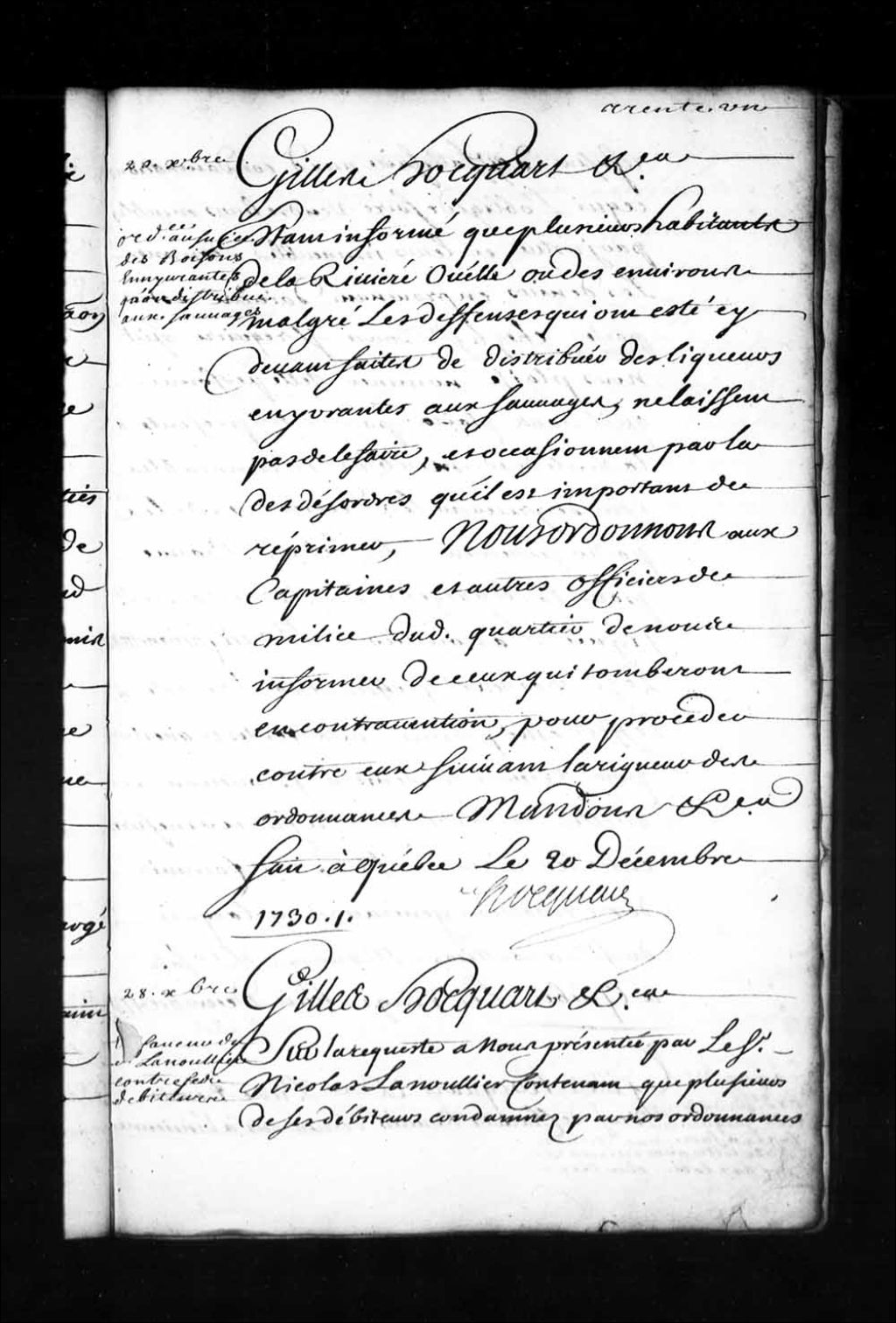 Ordonnance de Gilles Hocquart, faisant les fonctions d'intendant, qui commet le sieur Boisseau, greffier de la Prévôté de Québec, pour être présent aux ventes de meubles et immeubles ordonnées par justice à la demande de Nicolas Lanoullier (Lanouiller), recevoir les deniers en provenant et les remettre à fur et à mesure entre les mains du sieur Baune (Beaune), commis des trésoriers généraux, en l'acquit dudit sieur Lanoullier (Lanouiller), 28 décembre 1730, Archives nationales à Québec, Fonds Intendants, (03Q,E1,S1,D19,P2250).