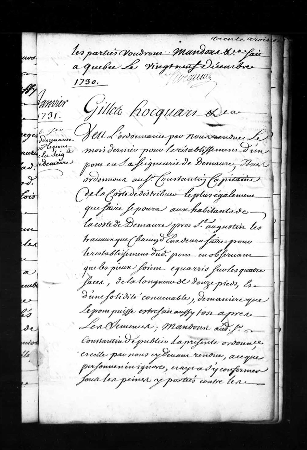 Ordonnance de Gilles Hocquart, faisant les fonctions d'intendant, qui donne instruction au sieur Constantin, capitaine de la côte de Maure, de distribuer le plus également que faire se pourra aux habitants de ladite côte les travaux que chacun d'eux devra faire pour le rétablissement du pont ordonné le mois dernier, 5 janvier 1731, Archives nationales à Québec, Fonds Intendants, (03Q,E1,S1,D19,P2252).