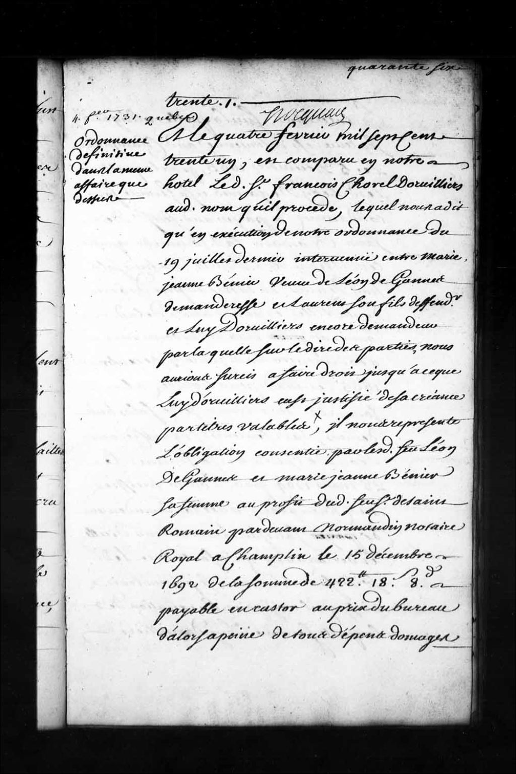 Ordonnance de Gilles Hocquart, faisant les fonctions d'intendant, qui règle que la terre de Léon Degannes (Deganne), située en la seigneurie de Champlain, est hypothéquée pour une créance de François Chorel Dorvilliers; permis audit Dorvilliers de la faire vendre pour, une fois payé de sa créance de quatre cent vingt-deux livres, remettre le surplus à Marie-Jeanne Bénier (Beignet), veuve de Léon DeGannes père, 4 février 1731, Archives nationales à Québec, Fonds Intendants, (03Q,E1,S1,D19,P2265).