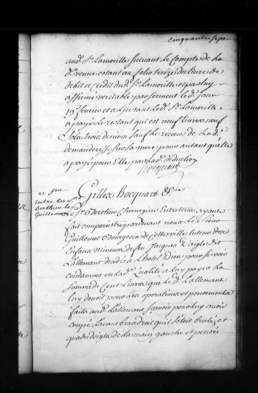 Ordonnance de Gilles Hocquart, faisant les fonctions d'intendant, qui condamne le sieur Guillemot, bourgeois à Québec, tuteur des mineurs de feu Jacques Daigle dit Lalemant (Lallemand), à payer au sieur Bertier (Berthier), chirurgien entretenu, la somme de cinquante livres pour avoir coupé l'avant-bras droit qu'il s'était brûlé et quatre doigts de la main gauche et pansé le feu sieur Daigle dit Lallemant pendant trente-deux jours, 21 février 1731, Archives nationales à Québec, Fonds Intendants, (03Q,E1,S1,D19,P2274).