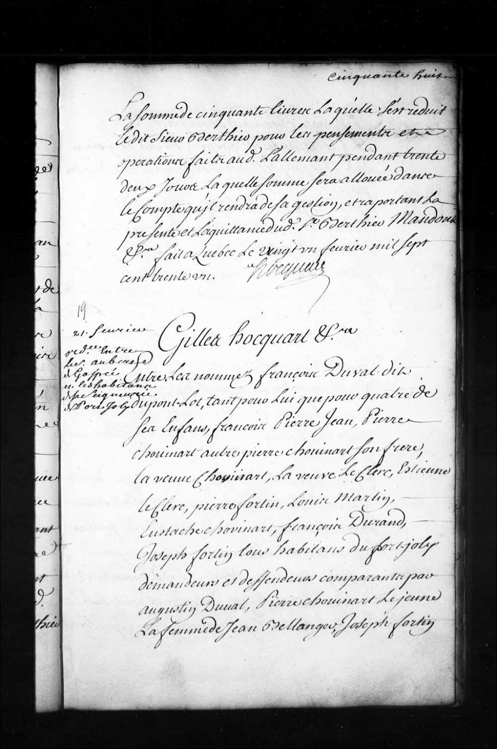 Ordonnance de Gilles Hocquart, faisant les fonctions d'intendant, qui condamne François Duval dit Dupont-Lot (Dupolo), François-Pierre Jean, Pierre Chouinard, autre Pierre Chouinard, la veuve Chouinard, la veuve Leclerc, Étienne Leclerc, Pierre Fortin, Louis Martin, Eustache Chouinard, François Durand, Joseph Fortin, habitants de Port-Joli, à payer à Pierre Aubert de Gaspé, seigneur dudit Port-Joli, les arrérages de cens et rentes et le chapon en nature ou en argent au choix dudit seigneur