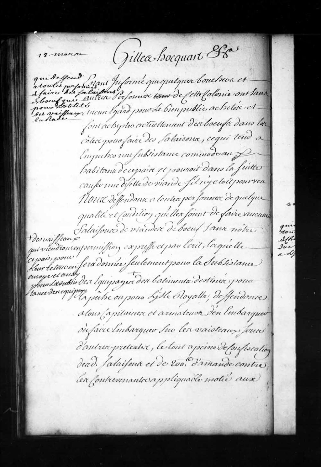 Ordonnance de l'intendant Hocquart qui défend à toutes personnes de faire aucunes salaisons de viande de boeuf sans la permission expresse et écrite de l'intendant, laquelle permission sera donnée seulement pour la subsistance des équipages des vaisseaux qui viendront en ce pays pour leur retour en Europe et aussi pour la subsistance des équipages des bâtiments destinées pour la pêche ou pour l'île Royale; défense aux capitaines et armateurs d'en embarquer sur les vaisseaux sous d'autres prétextes, le tout à peine de confiscation desdites salaisons et de deux cents livres d'amende contre les contrevenants, applicable moitié aux hôpitaux et moitié aux dénonciateurs, 18 mars 1731, Archives nationales à Québec, Fonds Intendants, (03Q,E1,S1,D19,P2285).