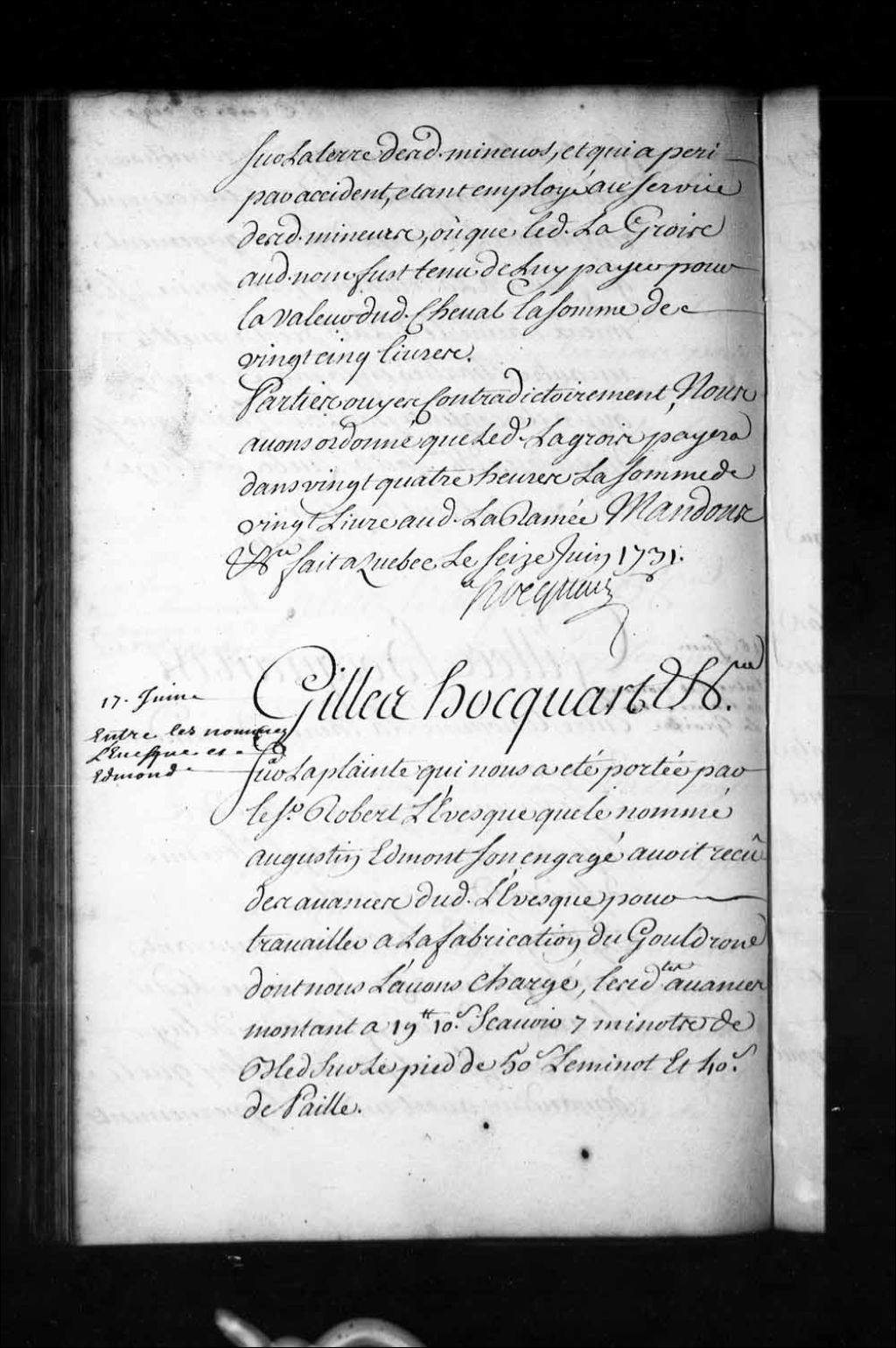 Ordonnance de l'intendant Hocquart qui condamne Augustin Émond à rembourser une somme de dix-neuf livres à son patron, Robert Lévesque; défense à tous de troubler ledit Lévesque dans son exploitation de goudron et de débaucher ses engagés, 17 juin 1731, Archives nationales à Québec, Fonds Intendants, (03Q,E1,S1,D19,P2325).
