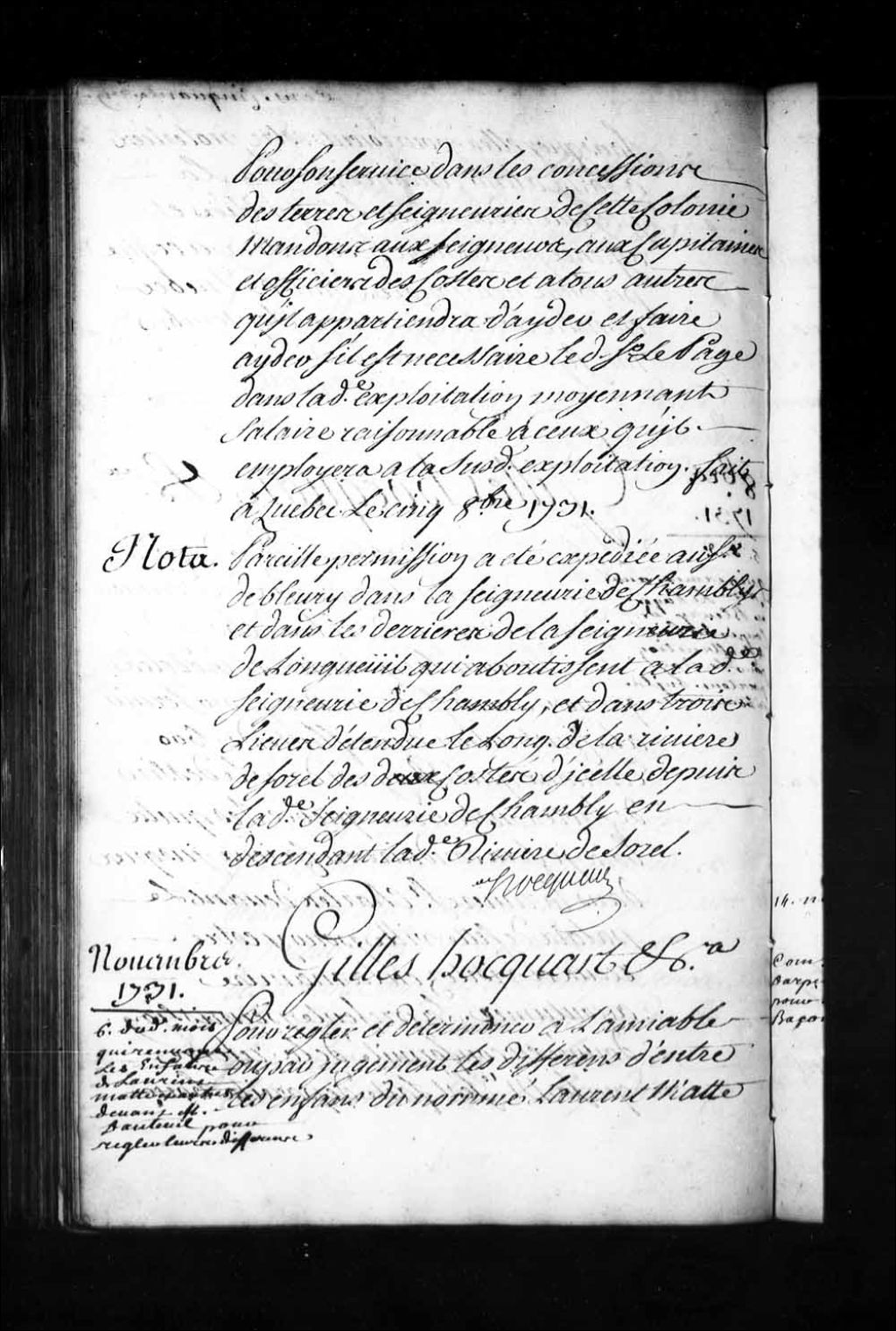 Ordonnance de l'intendant Hocquart qui permet au sieur de Bleury (Sabrevois) de faire exploiter dans les seigneuries de Chambly et de Longueuil 2000 pieds cubes de bois de chêne pour servir à la construction d'une flûte (bateau) de 500 tonneaux que le Roi est dans le dessein de faire construire à Québec