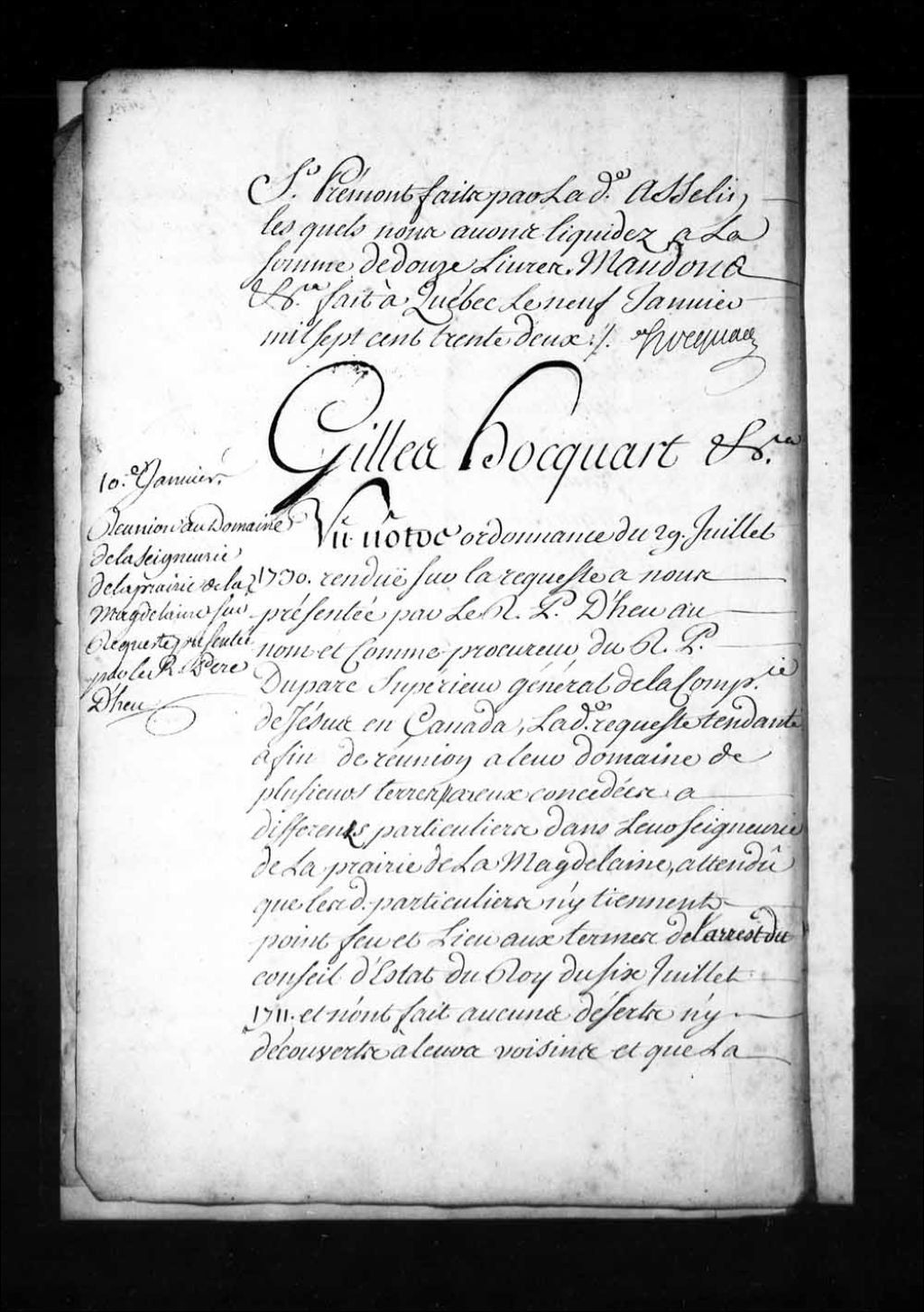 Ordonnance de l'intendant Hocquart qui réunit au domaine de la seigneurie de la Prairie-de-la-Madeleine appartenant aux Pères Jésuites les terres des héritiers de feu Joseph Laroche, des héritiers de feu Gabriel Laroche, Jean Bouy (Lebuis) dit Lavergne, Nicolas Lamarche, Louis Sainte-Marie, Jean Haguenier, François Dumont, Philippe Beaudin, Stanislas Saint-Michel, les héritiers de Pierre Babeu, Jean Barrois, Jean Gosselin, les héritiers de François Lefebvre, Charles Hélie (Élie), qui ne tiennent point feu et lieu