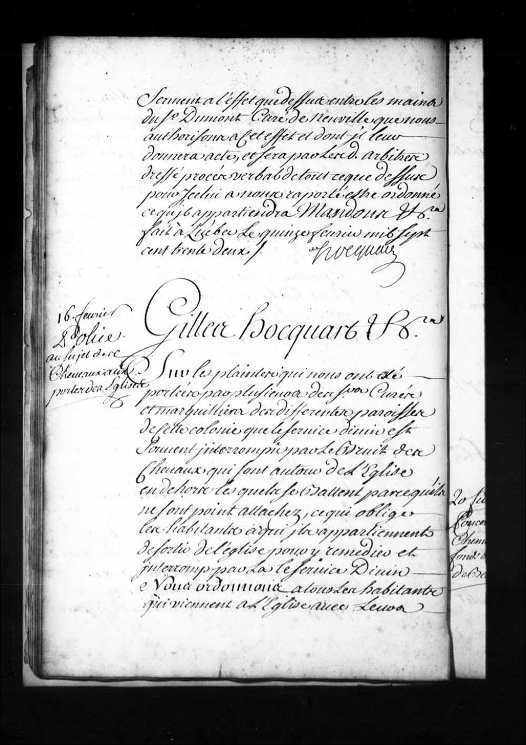 Ordonnance de l'intendant Hocquart qui oblige tous les habitants qui viennent à l'église avec leurs carrioles d'attacher leurs chevaux aux clôtures voisines de l'église et autres lieux commodes de manière que le service divin n'en soit pas interrompu; très expresses défenses et inhibitions aux habitants de sortir de l'église pendant le service et le prône pour fumer et causer, au scandale des autres paroissiens, à peine de dix livres d'amende, 16 février 1732, Archives nationales à Québec, Fonds Intendants, (03Q,E1,S1,D20,P2382).