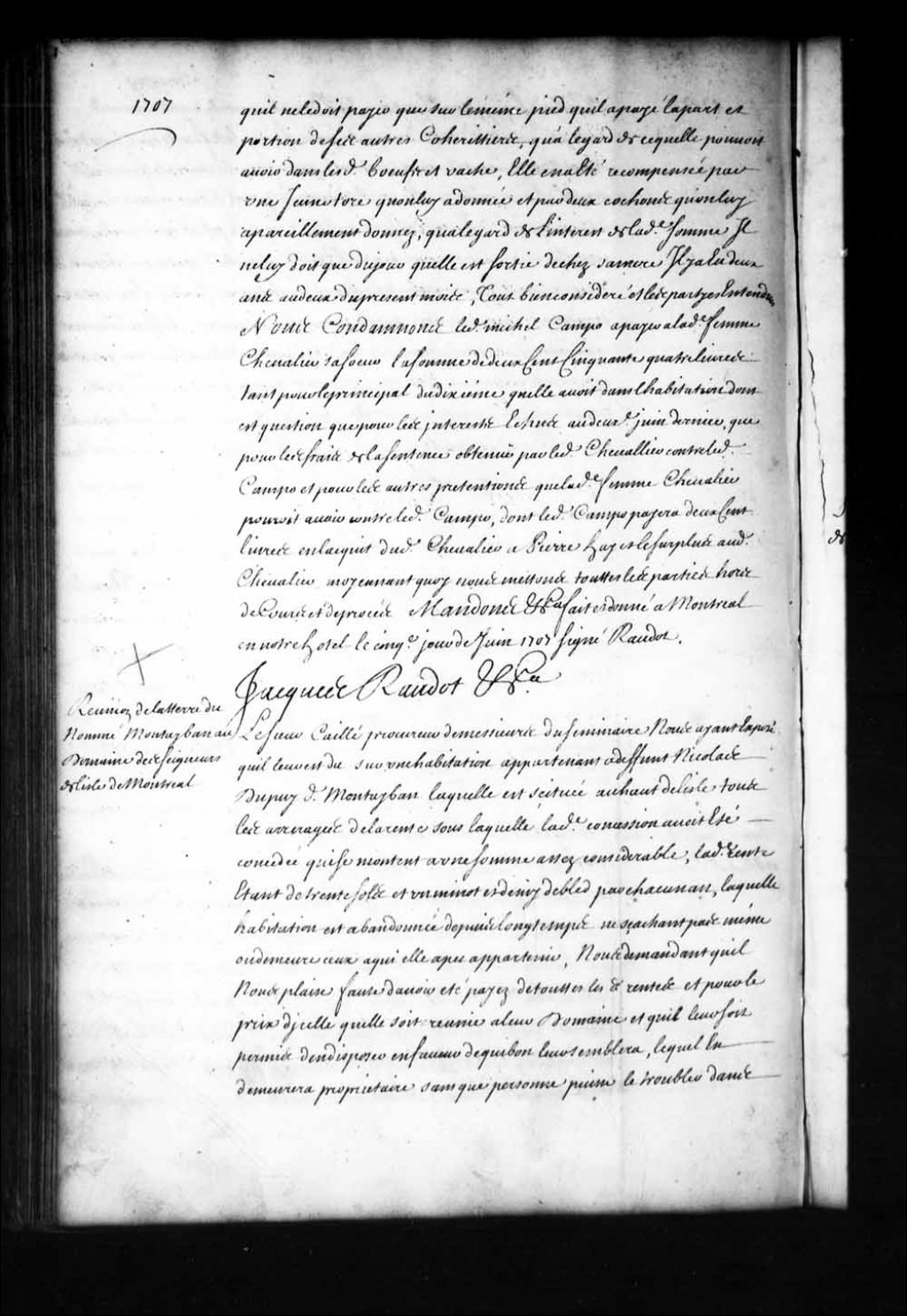 Ordonnance de l'intendant Jacques Raudot qui réunit au domaine des seigneurs de Montréal une habitation appartenant à feu Nicolas Dupuy dit Montauban (Dupuis) située au haut de l'île de Montréal et qui est abandonnée depuis longtemps