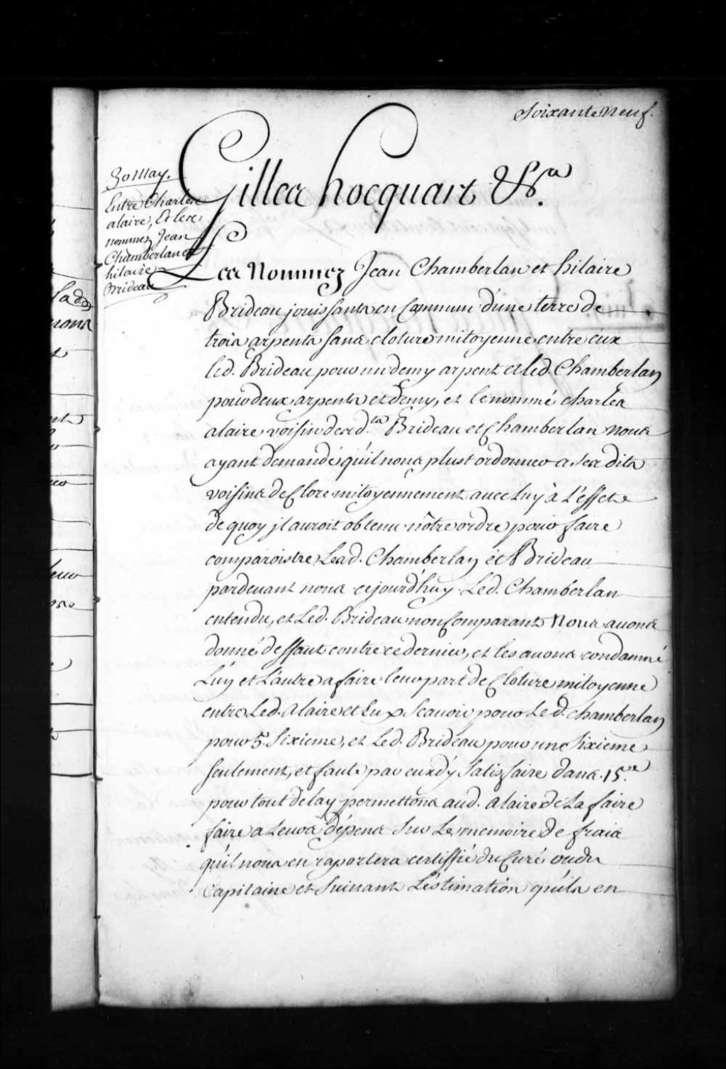 Ordonnance de l'intendant Hocquart qui condamne Jean Chamberland et Hilaire Brideau à faire leur part de clôtures mitoyennes entre leurs terres et celle de Charles Allaire, 30 mai 1732, Archives nationales à Québec, Fonds Intendants, (03Q,E1,S1,D20,P2420).