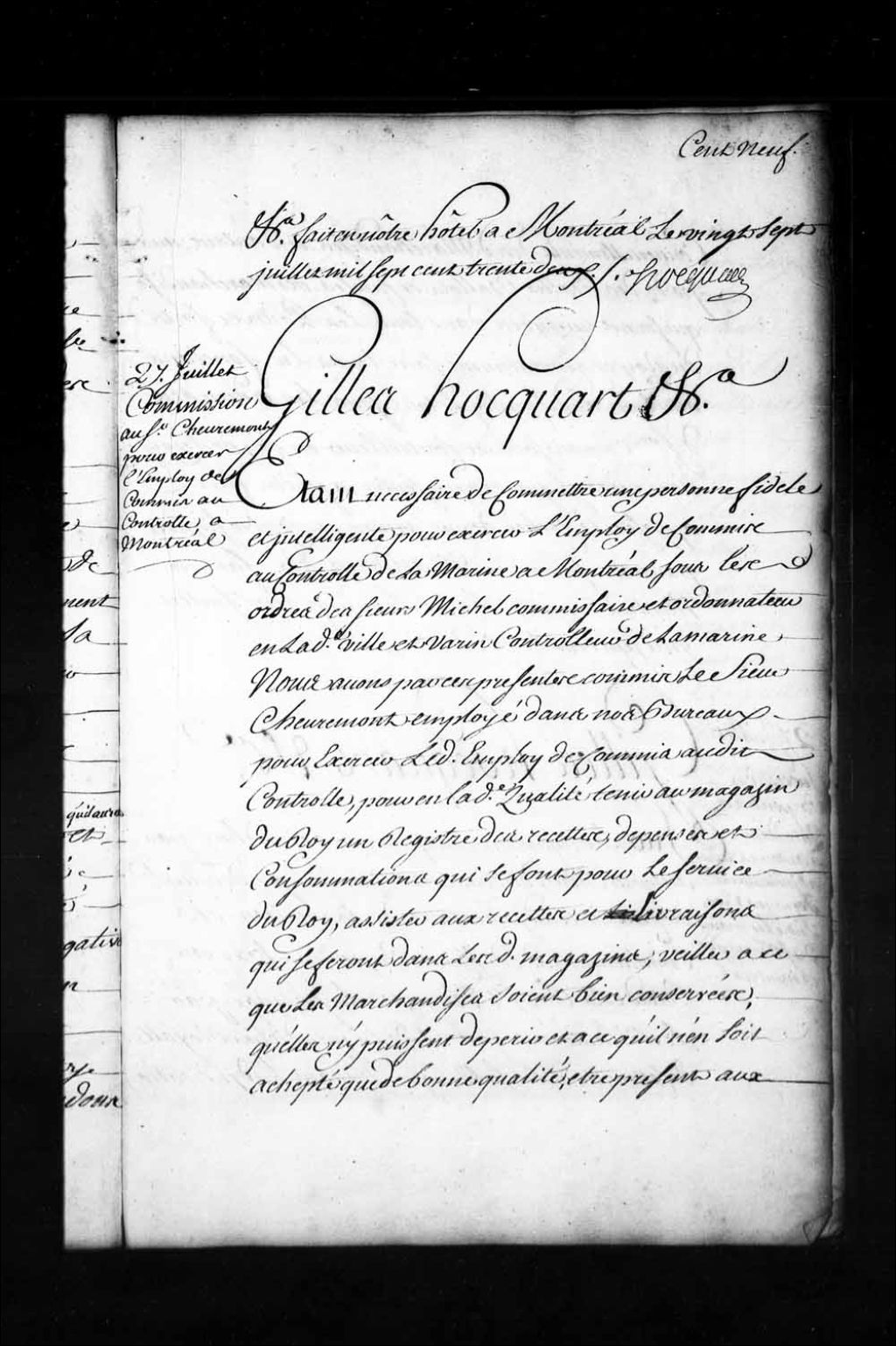 Commission au sieur Chevremont (Gaudron), employé dans les bureaux de l'intendance, par l'intendant Hocquart pour, en qualité de commis au contrôle de Montréal, tenir au magasin du Roi un registre des recettes, dépenses et consommations qui se font pour le service du Roi, assister aux recettes et livraisons qui se feront dans ledit magasin, veiller à ce que les marchandises soient bien conservées, etc, 27 juillet 1732, Archives nationales à Québec, Fonds Intendants, (03Q,E1,S1,D20,P2460).