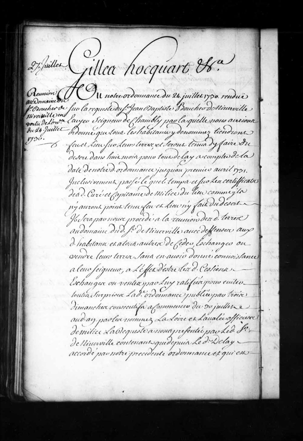 Ordonnance de l'intendant Hocquart qui réunit au domaine de Jean-Baptiste Boucher de Niverville, seigneur de Chambly, les terres de Marien Lebault (Lebeau), Lépine, Nicolas Favereau (Favreau), Michel Charbonneau, André Languedoc, Joseph Labrie, Étienne Petit, Antoine Roy, Pierre Marier, Jean Archambault, Joseph Lorion, Jean Millet, André Archambault, François Chrétien, Pierre Groulx, François Serot (Serau) Lespagnol, Pierre Avare, Jean-Baptiste Cousineau, Ignace Martin, qui ne tiennent point feu et lieu
