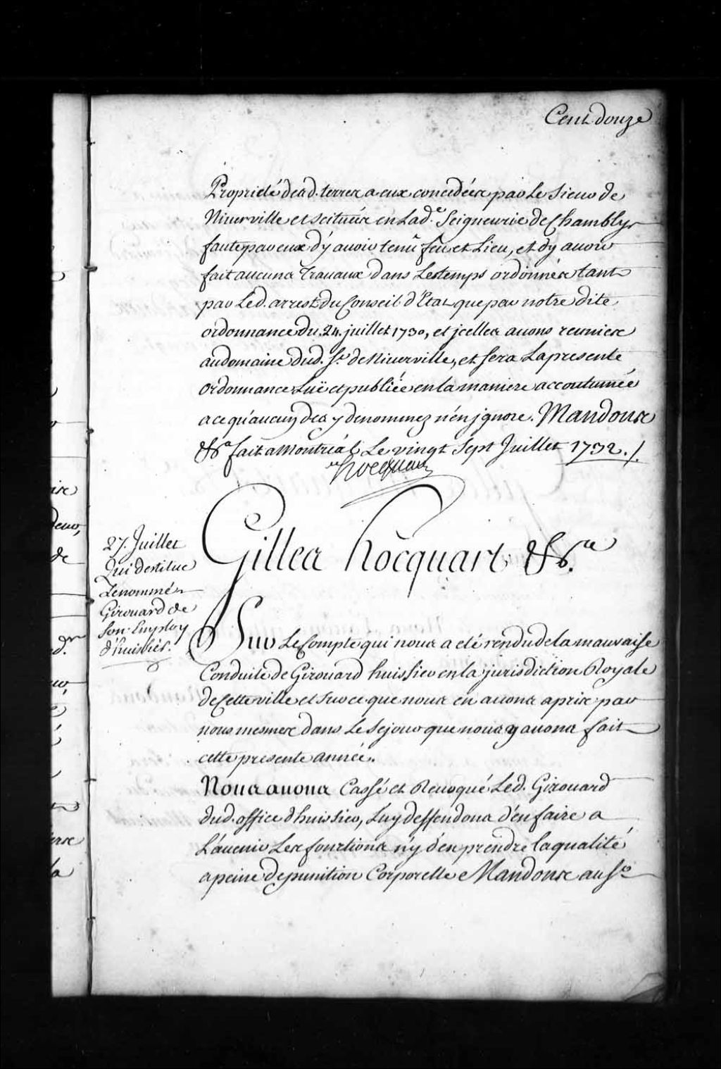 Ordonnance de l'intendant Hocquart qui casse et révoque le nommé Girouard, huissier en la Juridiction royale de Montréal, à cause de sa mauvaise conduite, et lui défend de faire à l'avenir les fonctions d'huissier ni d'en prendre la qualité à peine de punition corporelle, 27 juillet 1732, Archives nationales à Québec, Fonds Intendants, (03Q,E1,S1,D20,P2463).