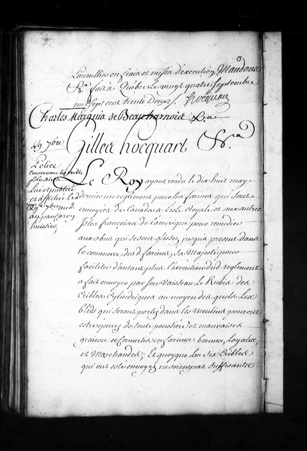 Ordonnance du gouverneur de Beauharnois et de l'intendant Hocquart qui porte que les six cribles hydrauliques envoyés par Sa Majesté dans le vaisseau "le Rubis" seront remis aux propriétaires des moulins du Sault-à-la-Puce, du Petit-Pré, de Beauport, de la Pointe-de-Lévy, de Saint-Nicolas et de la Sainte-Famille de l'île d'Orléans à l'effet de les installer dans leurs moulins dans quinzaine pour y faire passer et cribler tous les blés généralement quelconques; défense auxdits propriétaires de moulins et à leurs meuniers de moudre aucun blé qui n'ait été criblé à peine de cent livres d'amende pour la première fois et du double en cas de récidive