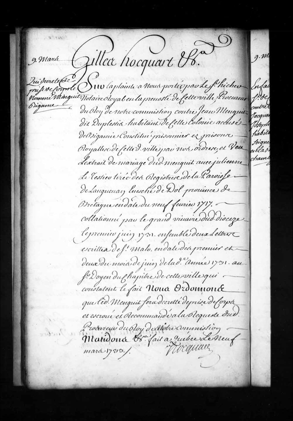 Ordonnance de l'intendant Hocquart qui décrète de prise de corps Jean Menguit (Mainguy) dit Duplessis, bigame