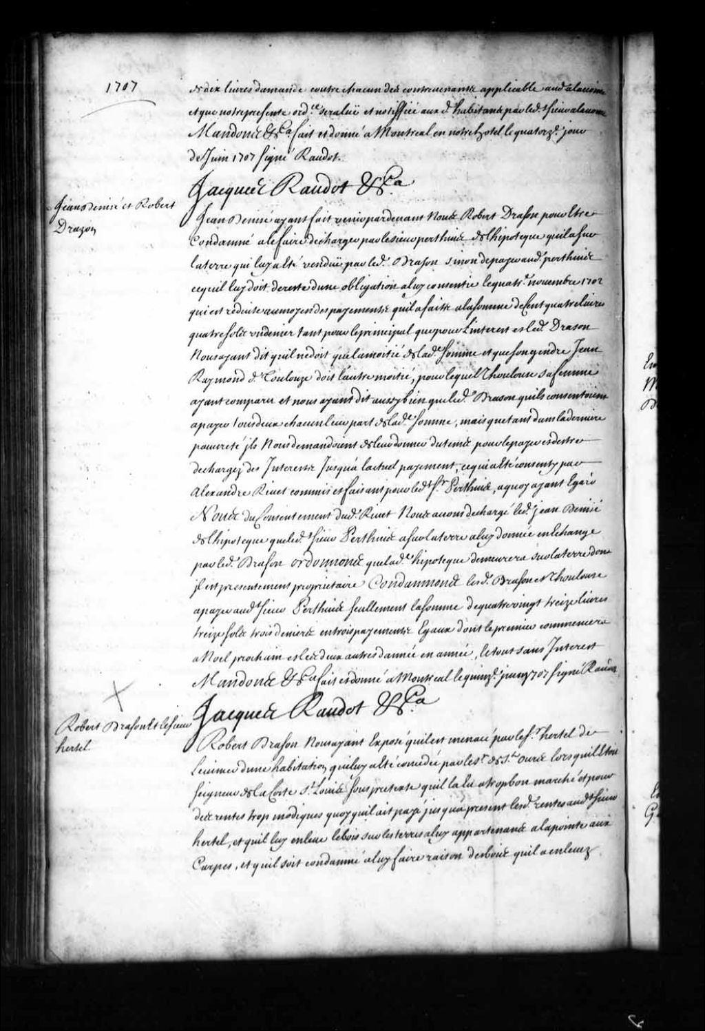 Ordonnance de l'intendant Jacques Raudot qui décharge Jean Denis de l'hypothèque que le sieur Perthuis a sur la terre à lui donnée en échange par Robert Drasson (Dresson) et qui porte que ladite hypothèque demeurera sur la terre dont Drasson est présentement propriétaire, 15 juin 1707, Archives nationales à Québec, Fonds Intendants, (03Q,E1,S1,D1,P255).