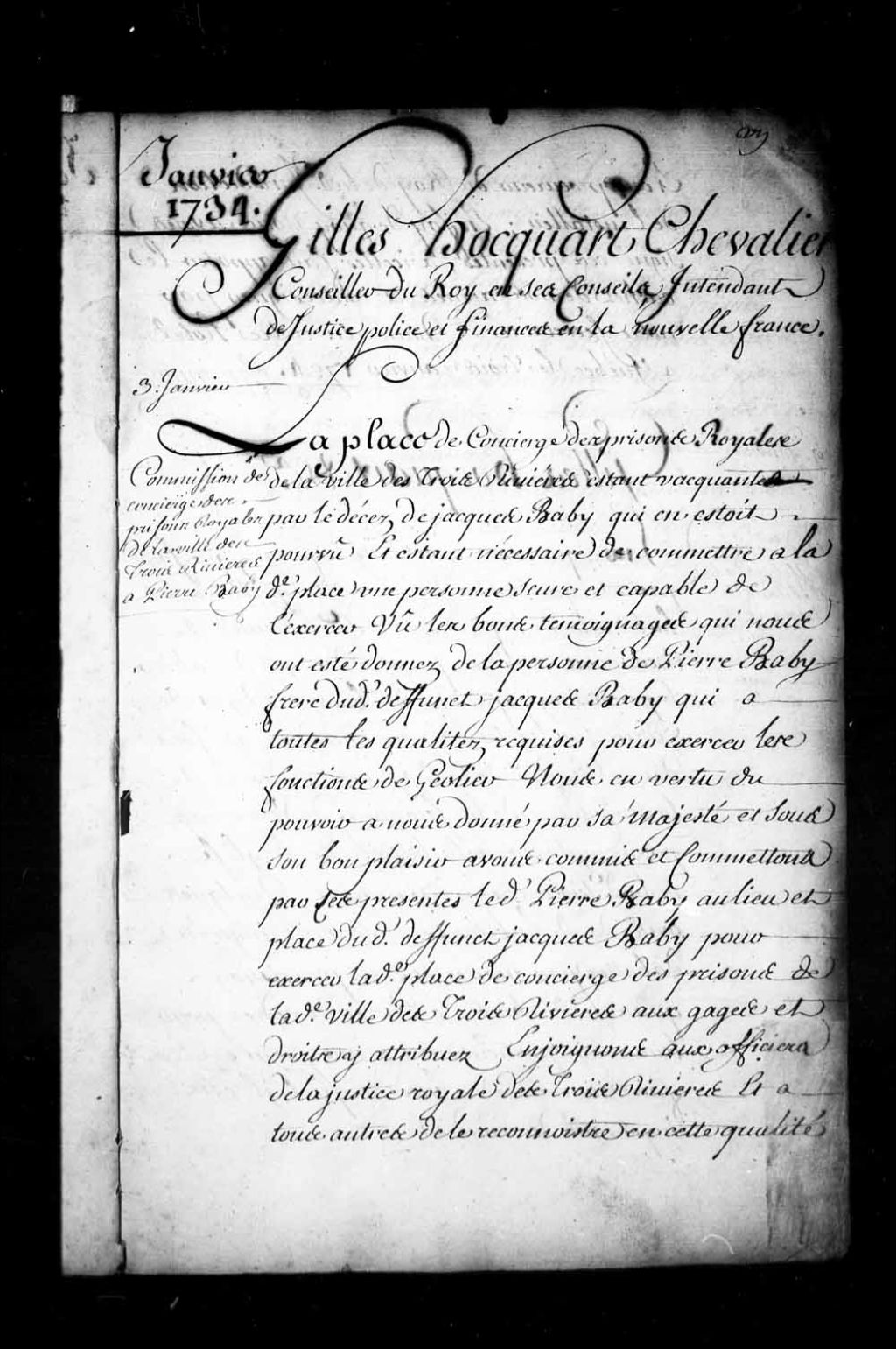 Commission de concierge des prisons royales de la ville des Trois-Rivières par l'intendant Hocquart pour le sieur Pierre Baby (Babie), en remplacement de Jacques Baby, son frère, décédé, 3 janvier 1734, Archives nationales à Québec, Fonds Intendants, (03Q,E1,S1,D22,P2580).