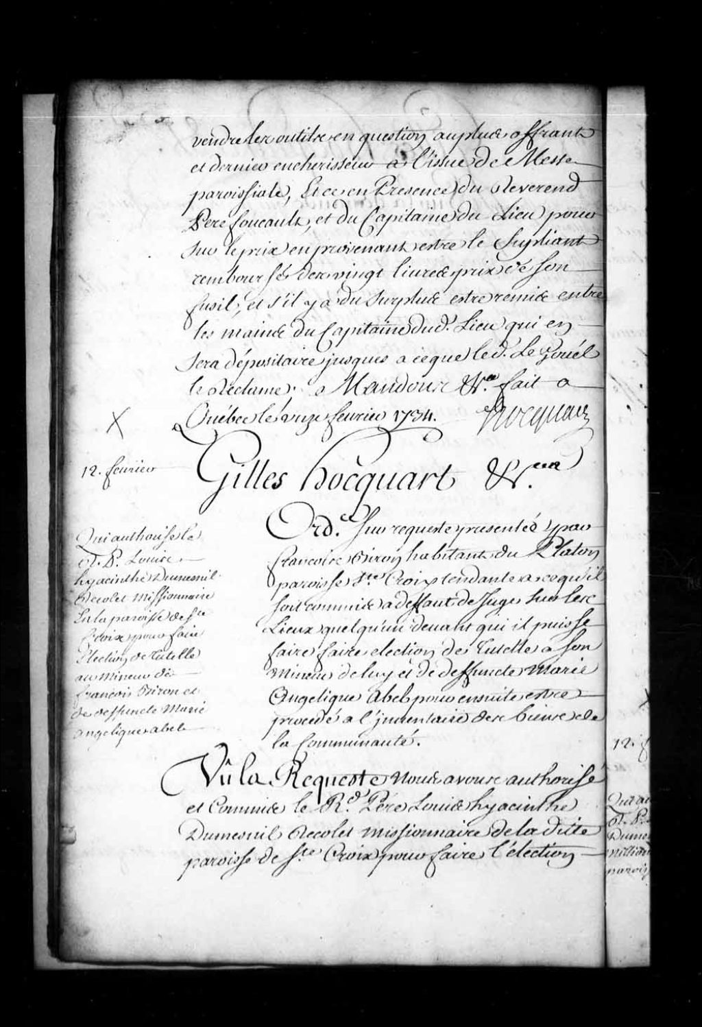 Ordonnance de l'intendant Hocquart qui autorise le Père Hyacinthe Dumesnil, récollet, missionnaire en la paroisse de Sainte-Croix, à faire élection de tutelle au mineur de François Biron et de défunte Marie-Angélique Abel, 12 février 1734, Archives nationales à Québec, Fonds Intendants, (03Q,E1,S1,D22,P2593).