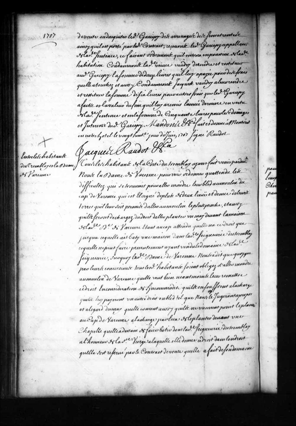 Ordonnance de l'intendant Jacques Raudot qui décharge les habitants de la côte du Tremblay, du consentement de la dame de Varennes, du droit qu'elle a sur eux d'aller moudre au moulin du cap de Varennes à la charge par eux de lui payer un minot de blé pour chaque deux arpents de front, laquelle ordonnance porte en outre que lesdits habitants de la côte du Tremblay sont aussi déchargés, du consentement de la dame de Varennes, d'aller planter un mai devant sa maison du cap de Varennes à la charge par eux de le planter devant la chapelle qu'elle a dessein de faire bâtir en l'honneur de la Sainte Vierge dans sa seigneurie du Tremblay