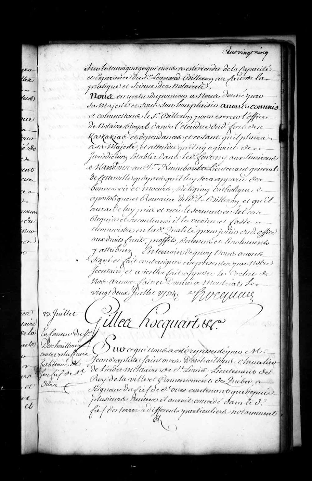 Ordonnance de l'intendant Hocquart en faveur de Jean-Baptiste Deschaillons, chevalier de Saint-Louis, lieutenant du Roi à Québec, seigneur du fief de Saint-Ours, contre le nommé Blanchet, les héritiers Crédit (Crédy), Pierre Dansereau, Chartier, Maheu, Desjardins, Laperle, les mineurs Poitevin, habitants de son fief qui ne tiennent point feu et lieu; le délai d'une année leur est accordé pour tenir feu et lieu et mettre leurs terres en valeur, 23 juillet 1734, Archives nationales à Québec, Fonds Intendants, (03Q,E1,S1,D22,P2694).