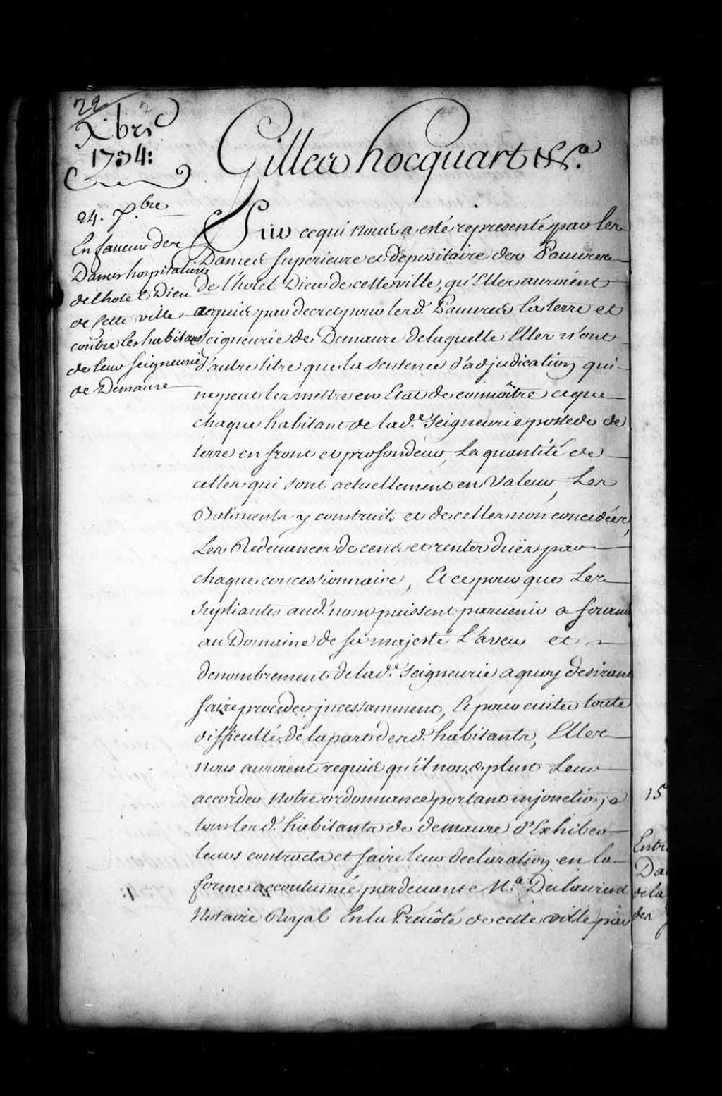 Ordonnance de l'intendant Hocquart qui oblige les habitants, tenanciers et censitaires de la terre et seigneurie de Maure appartenant aux pauvres de l'Hôtel-Dieu de Québec à fournir au sieur Dulaurent, notaire royal en la Prévôté de Québec, leurs déclarations fidèles et exactes de ce qu'ils possèdent de terre en front et profondeur, la quantité de celles en valeur, les bâtiments dessus construits, les cens et rentes dont lesdites terres sont chargées et à cet effet d'exhiber les contrats et autres titres de propriété qu'ils ont desdites terres, le tout à peine d'amende arbitraire et des dépens, dommages et intérêts, 24 décembre 1734, Archives nationales à Québec, Fonds Intendants, (03Q,E1,S1,D22,P2712).