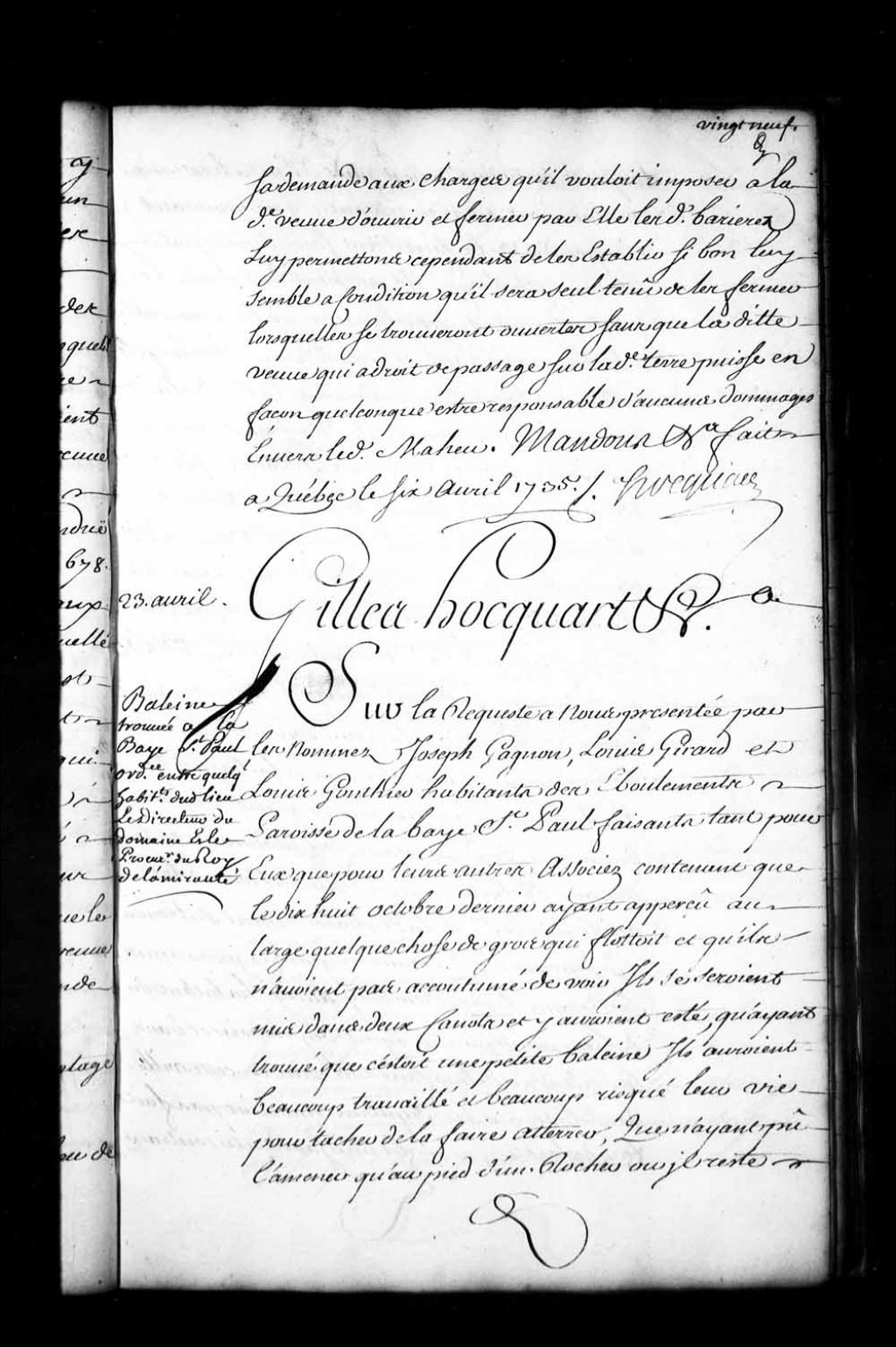 Ordonnance de l'intendant Hocquart qui renvoie Joseph Gagnon, Louis Girard et Louis Gonthier, habitants des Éboulements, paroisse de la Baie-Saint-Paul, à se pourvoir par-devant le juge de l'Amirauté de Québec au sujet de la baleine qu'ils ont trouvée en pleine mer et réussi à faire échouer, 23 avril 1735, Archives nationales à Québec, Fonds Intendants, (03Q,E1,S1,D23,P2735).