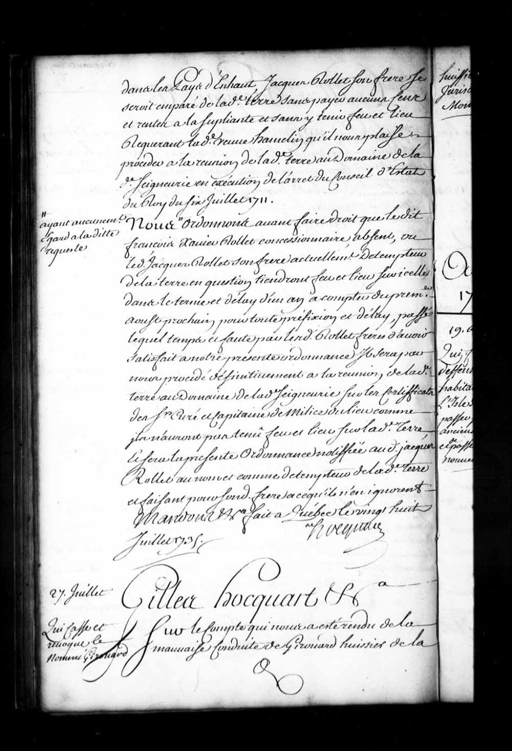 Ordonnance de l'intendant Hocquart qui casse et révoque, à cause de sa mauvaise conduite dans les fonctions de son emploi, le nommé Girouard, huissier de la Juridiction royale de Montréal, lui fait défense d'en prendre la qualité et d'en faire les fonctions à l'avenir sous peine de punition corporelle, 27 juillet 1735, Archives nationales à Québec, Fonds Intendants, (03Q,E1,S1,D23,P2757).