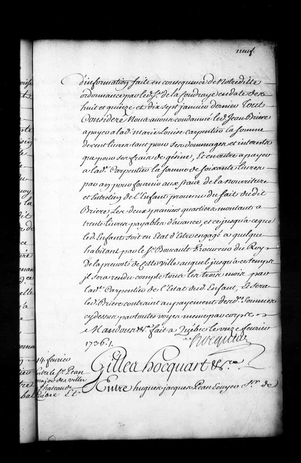 Ordonnance de l'intendant Hocquart entre Hugues-Jacques Péan, sieur de Livaudière, chevalier de Saint-Louis, major des ville et château de Québec, et Hubert-Joseph Lacroix, chirurgien, de Québec, au sujet de la vente du fief Saint-Joseph, 14 février 1736, Archives nationales à Québec, Fonds Intendants, (03Q,E1,S1,D24,P2797).