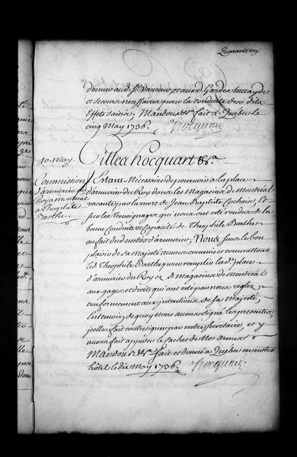 Commission d'armurier du Roi dans les magasins de Montréal par l'intendant Hocquart pour Théophile Barthe, en remplacement de Jean-Baptiste Cochois, décédé