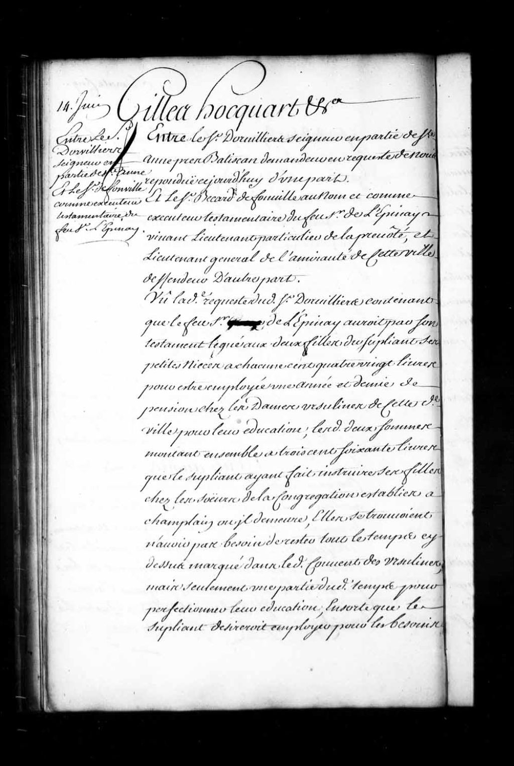 Ordonnance de l'intendant Hocquart qui porte que le sieur Bécard de Fonville (Bécart de Granville), au nom et comme exécuteur testamentaire du sieur Couillard de Lespinay (Lépinay, Lépiné), vivant lieutenant général de l'Amirauté de Québec, paiera sur le legs fait par ledit Couillard de Lespinay, à ses petites nièces, filles du sieur Dorvilliers (Chorel) seigneur en partie de Sainte-Anne, aux Dames Ursulines de Québec huit mois de pension pour chacune desdites filles montant à cent soixante livres en total, et que les deux cents livres restant seront employées par ledit sieur Bécard de Fonville en hardes et linges à l'usage desdites filles pour les mettre en état de demeurer dans le couvent des Ursulines pendant ledit temps de huit mois, 14 juin 1736, Archives nationales à Québec, Fonds Intendants, (03Q,E1,S1,D24,P2830).