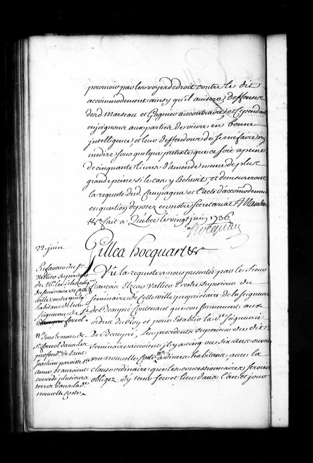 Ordonnance de l'intendant Hocquart qui condamne Claude Poulin, Germain Bolduc, Jean Poulin, Ignace Therrien, le nommé Martineau, Joseph Lessard, Claude Paré, Étienne Paré, Joseph Poulin, François Lessard, Joseph Racine, Augustin Simard, Étienne Morel, François Simard, Étienne Morel, Pierre Paré, le nommé Poitras, Pierre Lessard, Étienne Simard, Pierre Boivin et le nommé Corneau, concessionnaires de la côte de Saint-Ferréol, dans les profondeurs de la paroisse de Saint-Joachim, seigneurie de Beaupré, à tenir feu et lieu d'ici à un an sinon il sera procédé à la réunion de leurs terres au domaine des messieurs du séminaire de Québec, propriétaires de ladite seigneurie