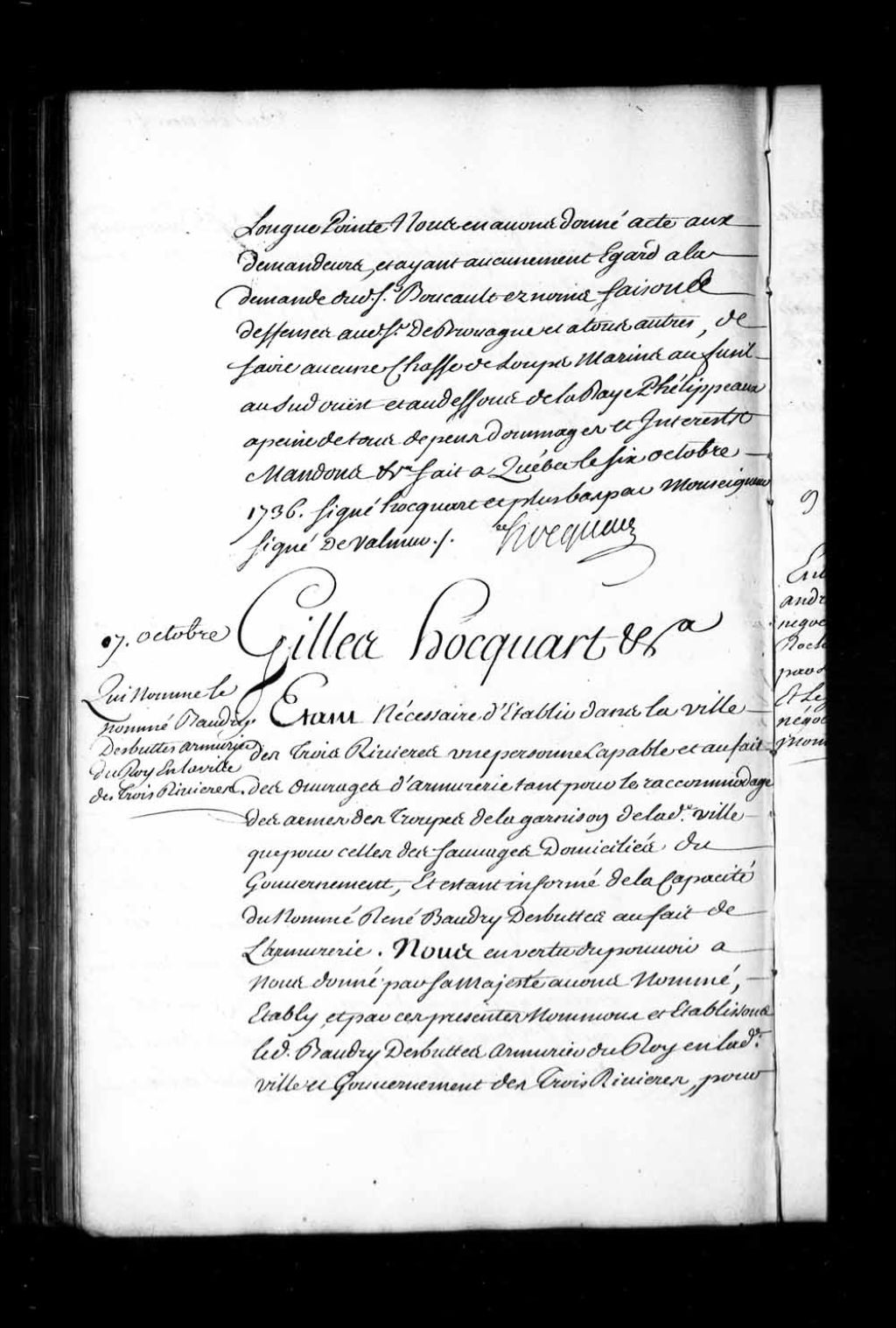 Commission d'armurier du Roi en la ville et gouvernement des Trois-Rivières par l'intendant Hocquart pour René Beaudry Desbuttes (Lamarche), 7 octobre 1736, Archives nationales à Québec, Fonds Intendants, (03Q,E1,S1,D24,P2870).