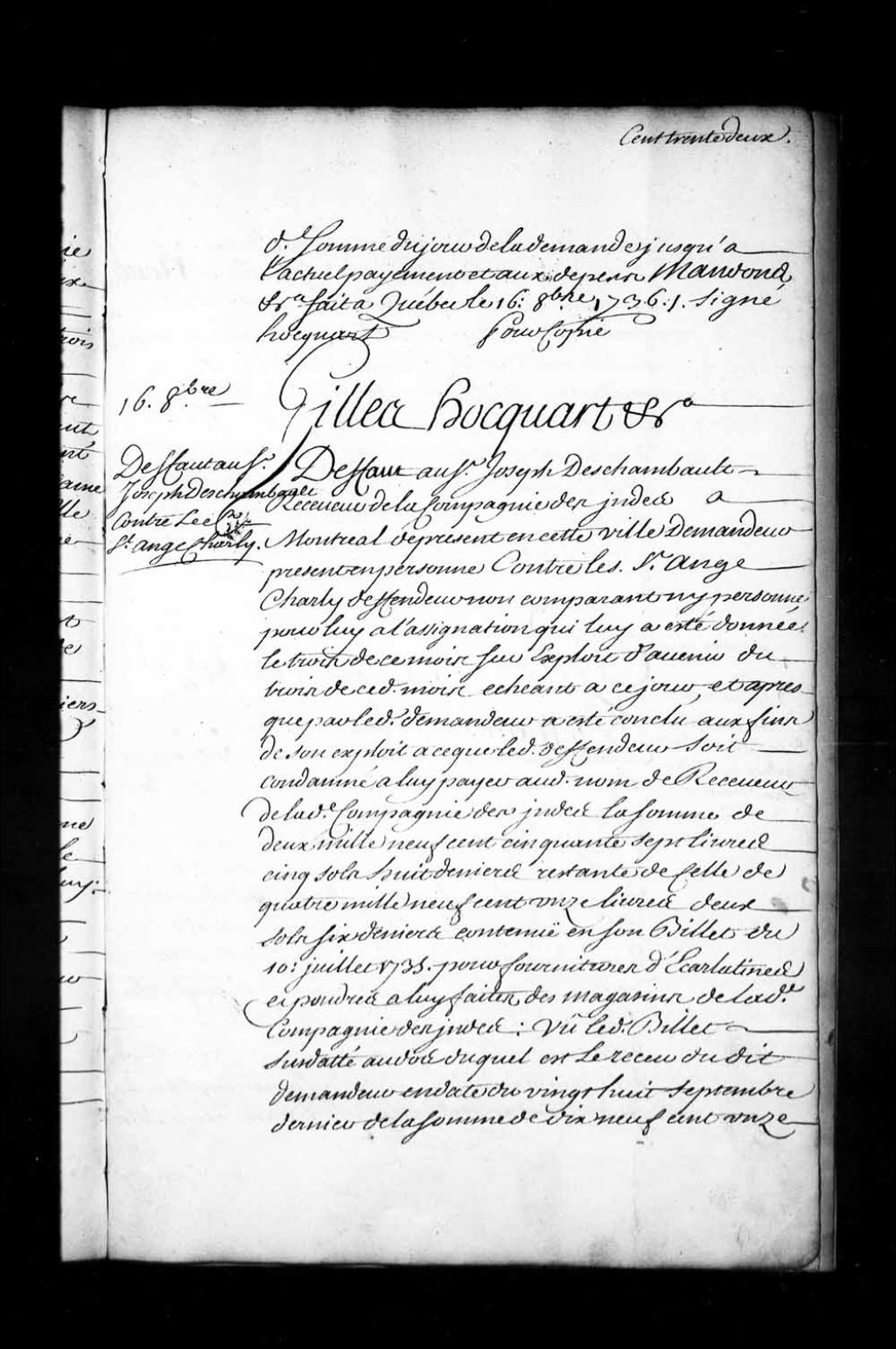 Ordonnance de l'intendant Hocquart qui condamne le sieur Charly Saint-Ange à payer à Joseph Deschambault, receveur de la Compagnie des Indes à Montréal, la somme de deux mille neuf cent cinquante-sept livres cinq sols huit deniers pour fourniture d'écarlatines et de poudres des magasins de ladite compagnie, 16 octobre 1736, Archives nationales à Québec, Fonds Intendants, (03Q,E1,S1,D24,P2885).