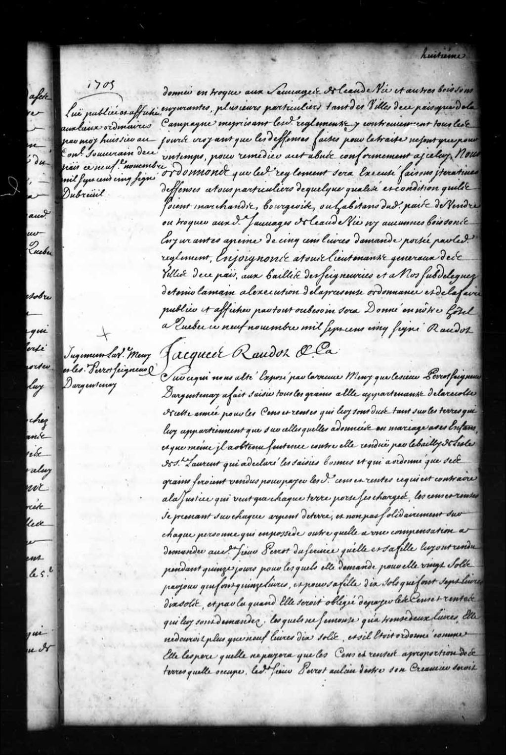 Ordonnance de l'intendant Jacques Raudot qui reçoit l'appel de la veuve Meny (Mesny), de la seigneurie d'Argentenay, appelante d'une saisie de grains et d'une sentence rendue contre elle par le bailli de l'île et comté de Saint-Laurent (île d'Orléans) pour cens et rentes dus au sieur Perrot (Perrault, Perreault), seigneur d'Argentenay; qui enjoint le gardien des grains de lui délivrer deux minots de blé pour la subsistance de sa famille; et qui renvoie les parties devant le sieur de Villeray, conseiller au Conseil supérieur de Québec, 9 novembre 1705, Archives nationales à Québec, Fonds Intendants, (03Q,E1,S1,D1,P29).