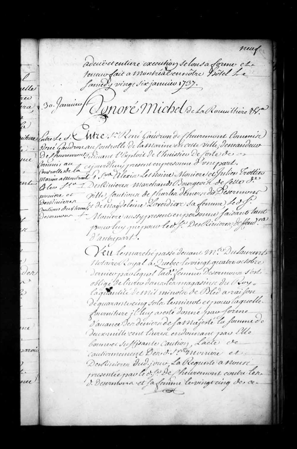 Ordonnance de Honoré Michel de Villebois de la Rouvilière, faisant les fonctions d'intendant, qui condamne Alexis Lemoine Monière (Lemoyne, Monier) et Julien Trottier Desrivières, marchands, de Montréal, cautions de Charles Demers dit Desermont (Dessermons) et de Madeleine Laverdière (Cochon), sa femme, solidairement et par corps comme pour les propres affaires de Sa Majesté, à payer et rembourser au Roi entre les mains du trésorier de la Marine, deux mille cent livres, somme donnée par forme d'avances audit Demers dit Desermont pour livrer dans les magasins du Roi la quantité de mille minots de blé à raison de quarante-cinq sols le minot, 30 janvier 1737, Archives nationales à Québec, Fonds Intendants, (03Q,E1,S1,D25,P2903).