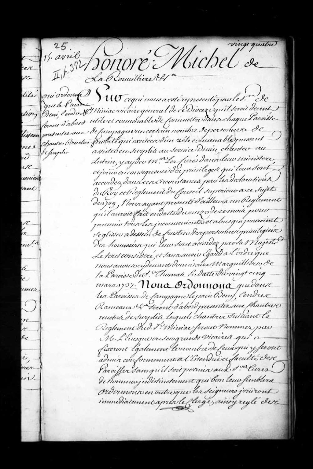 Ordonnance de Honoré Michel de Villebois de la Rouvilière, faisant les fonctions d'intendant, qui, sans avoir égard à son ordonnance du 23 mars 1737, décide que dans les paroisses de campagne le pain bénit, cendres, rameaux, etc., seront d'abord présentés aux chantres revêtus de surplis, lesquels chantres seront nommés par monseigneur l'évêque ou ses grands-vicaires, qui fixeront également le nombre de ceux qui y seront admis, conformément à l'étendue et faculté des paroisses, sans qu'il soit permis aux sieurs curés de nommer indistinctement qui bon leur semblera; les seigneurs jouiront, immédiatement après le clergé ainsi réglé, des honneurs et prérogatives qui leur sont accordés par les ordonnances de Sa Majesté et ainsi des autres, suivant l'ordre du règlement du Conseil
