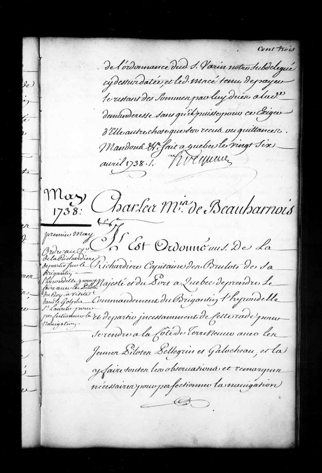 Ordonnance du gouverneur de Beauharnois et de l'intendant Hocquart qui commet le sieur de la Richardière (Testu), capitaine de brûlot (bateau) et du port de Québec, pour prendre le commandement du brigantin (bateau) "l'Hirondelle" et partir incessamment pour la côte de Terre-Neuve avec les jeunes pilotes Pellegrin et Galocheau, et là y faire toutes les observations et remarques nécessaires pour perfectionner la navigation du golfe Saint-Laurent ainsi que celle du fleuve, 1er mai 1738, Archives nationales à Québec, Fonds Intendants, (03Q,E1,S1,D26,P3014).
