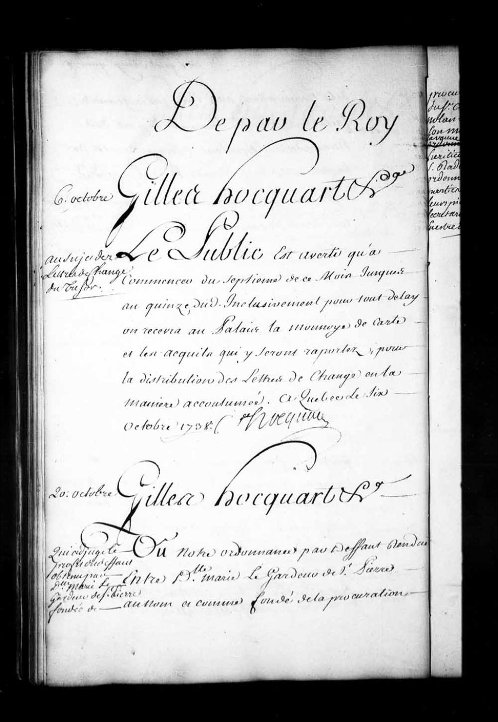 Ordonnance de l'intendant Hocquart qui avertit le public que du 7 au 15 octobre courant inclusivement on recevra au Palais de l'intendant la monnaie de carte et les acquits qui y seront rapportés pour la distribution des lettres de change, 6 octobre 1738, Archives nationales à Québec, Fonds Intendants, (03Q,E1,S1,D26,P3072).