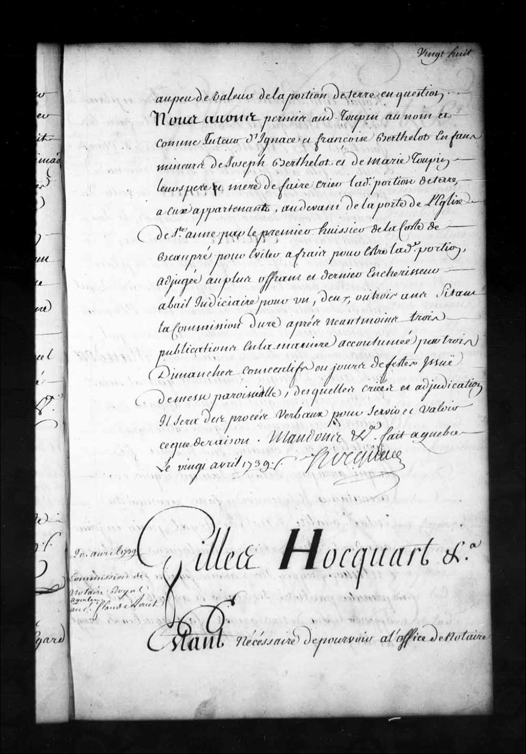 Commission de notaire royal en la Prévôté de Québec et dans toute l'étendue du gouvernement de Québec par l'intendant Hocquart pour Claude Louet fils au lieu et place de Claude Louet père qui est hors d'état d'en faire les fonctions, 20 avril 1739, Archives nationales à Québec, Fonds Intendants, (03Q,E1,S1,D27,P3112).