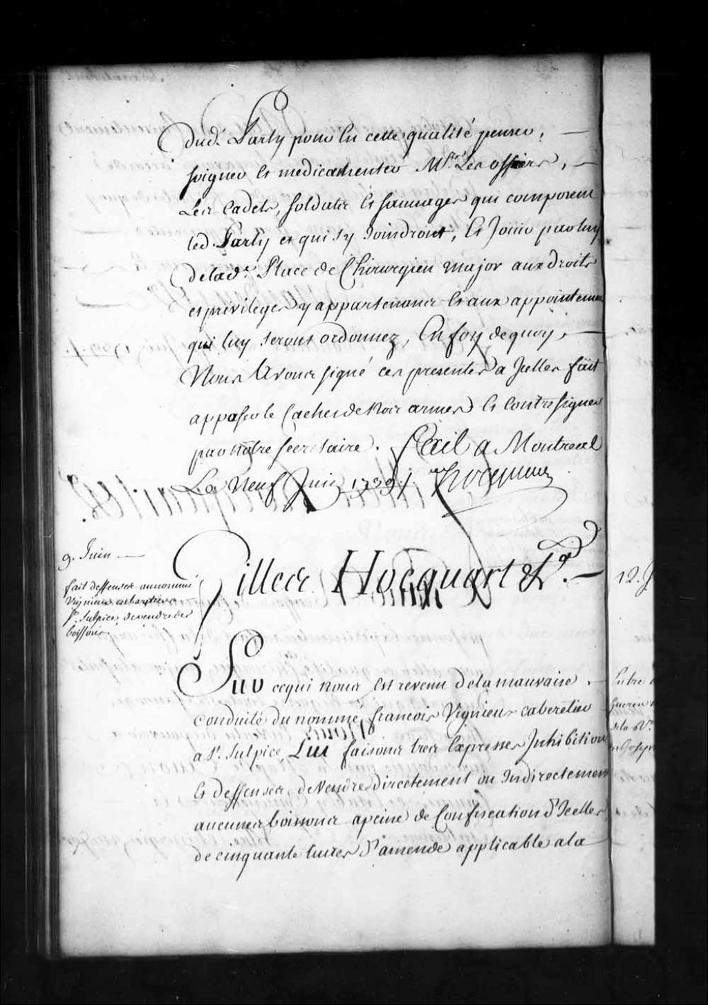 Ordonnance de l'intendant Hocquart qui, à cause de sa mauvaise conduite, défend à François Vignieux (Vigneux), cabaretier à Saint-Sulpice, de vendre directement ou indirectement aucunes boissons à peine de confiscation d'icelles et de cinquante livres d'amende applicable à la fabrique de la paroisse de Saint-Sulpice et même de punition corporelle si le cas y échet, 9 juin 1739, Archives nationales à Québec, Fonds Intendants, (03Q,E1,S1,D27,P3134).