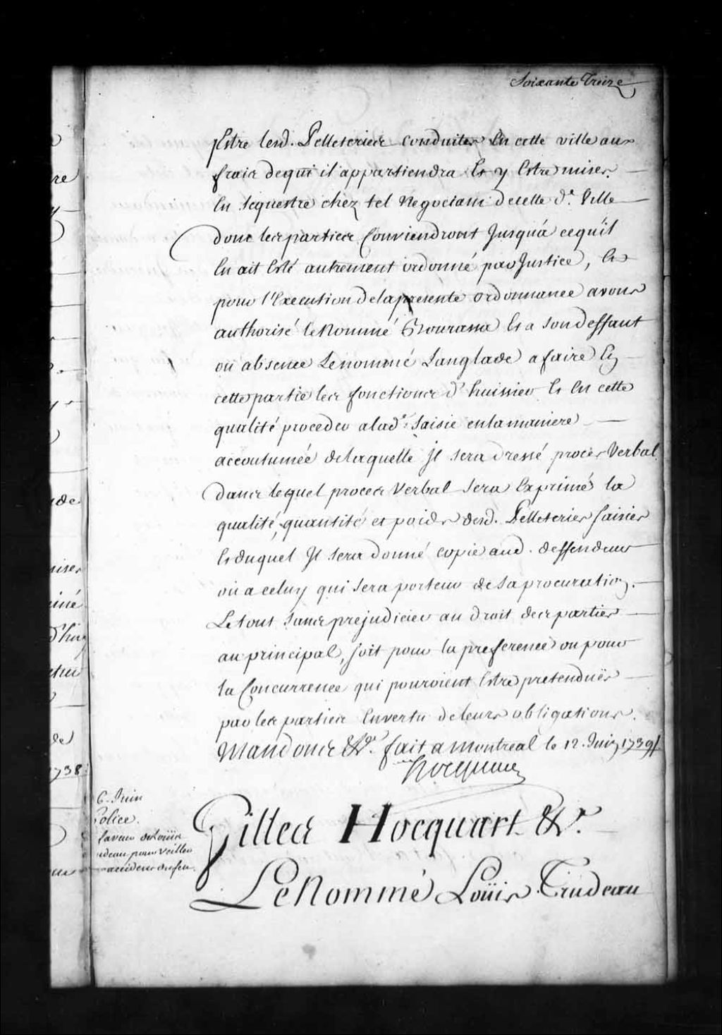 Ordonnance de l'intendant Hocquart qui pour récompenser Louis Trudeau, charpentier, résidant à Montréal, du zèle et de l'attention particulière qu'il a apportés dans les différents incendies qui ont eu lieu à Montréal, le décharge du logement des gens de guerre et en outre le gratifie d'une somme de trente livres par année, à la charge de visiter tous les quinze jours s'il est nécessaire ou au moins une fois chaque mois les seaux et ustensiles destinés pour remédier aux accidents du feu et en faire son rapport aux officiers de police qui doivent veiller à leur entretien, 16 juin 1739, Archives nationales à Québec, Fonds Intendants, (03Q,E1,S1,D27,P3137).