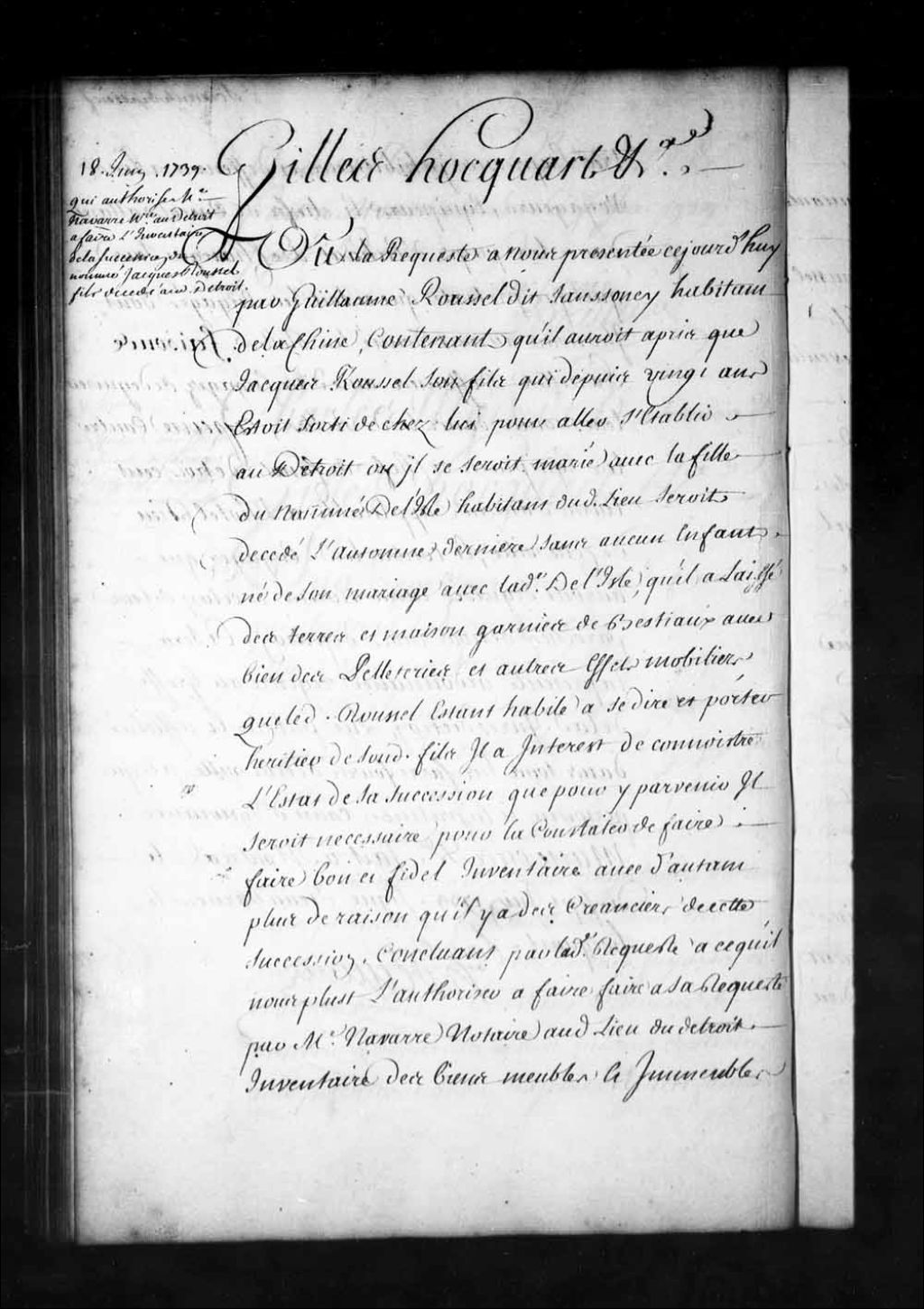Ordonnance de l'intendant Hocquart qui porte qu'à la requête de Marie-Anne Delisle, veuve de Jacques Roussel, habitant de Détroit, et à son défaut à celle de Guillaume Roussel dit Sansoucy, habitant de Lachine, il sera fait bon et fidèle inventaire des biens meubles et immeubles dépendants des communauté et succession dudit Jacques Roussel par le sieur Navarre, notaire au Détroit, et que pour sûreté et conservation des droits de qui il appartiendra les pelleteries et autres effets desdites succession et communauté seront transportés à Montréal pour y être mis en séquestre jusqu'à ce qu'il en ait été autrement ordonné