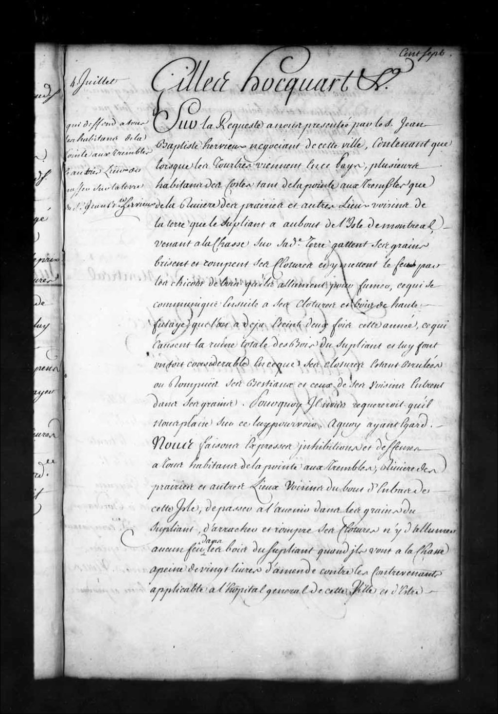 Ordonnance de l'intendant Hocquart qui fait défense à tous habitants de la Pointe-aux-Trembles, Rivière-des-Prairies et autres lieux voisins du bout d'en bas de l'île de Montréal de passer à l'avenir dans les grains de Jean-Baptiste Hervieux, d'arracher et rompre ses clôtures, ni d'y allumer aucun feu dans ses bois quand ils vont à la chasse aux tourtes à peine de vingt livres d'amende contre les contrevenants au profit de l'Hôpital général de Montréal, 4 juillet 1739, Archives nationales à Québec, Fonds Intendants, (03Q,E1,S1,D27,P3155).