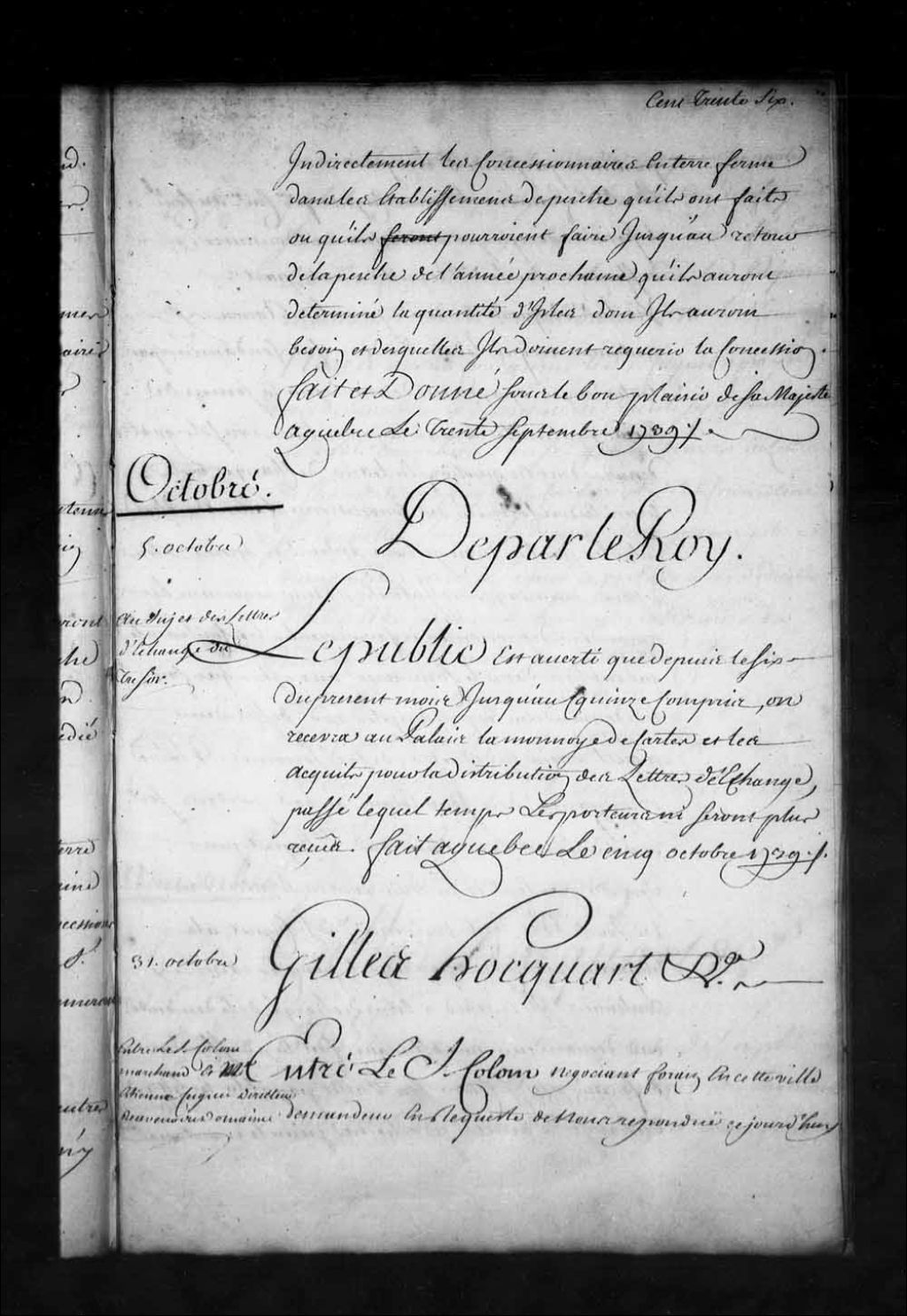 Ordonnance de l'intendant Hocquart qui avertit le public que du 6 au 15 octobre on recevra au Palais de l’intendant à Québec la monnaie de carte et les acquits pour la distribution des lettres de change