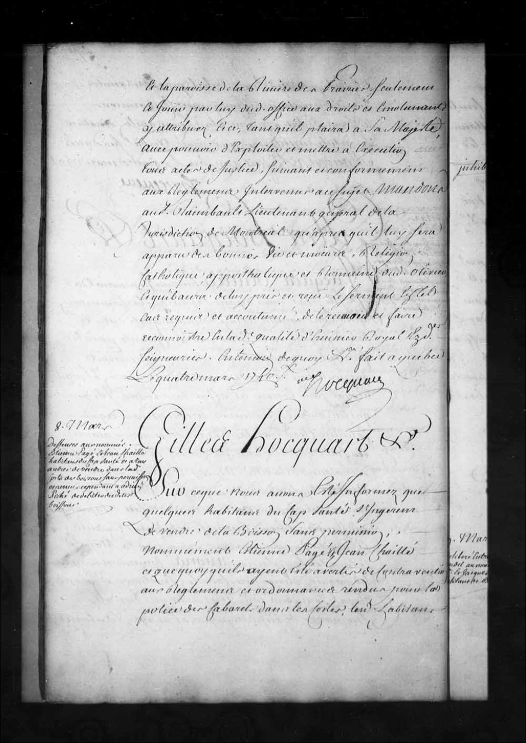 Ordonnance de l'intendant Hocquart qui fait itératives (de nouveau) inhibitions et défenses tant à Étienne Pagé et Jean Chaillier (Chaillé) qu'à tous les habitants du Cap-Santé de vendre ni débiter aucune liqueur de quelque nature qu'elle soit sans une permission de l'intendant; permis seulement à la veuve Germain et à Adrien Piché (Pichet) de débiter des boissons en se conformant à ce qui est prescrit dans les permissions à eux accordées; lesdits Étienne Pagé et Jean Chaillier condamnés chacun en l'amende de dix livres pour leur désobéissance, 8 mars 1740, Archives nationales à Québec, Fonds Intendants, (03Q,E1,S1,D28,P3197).