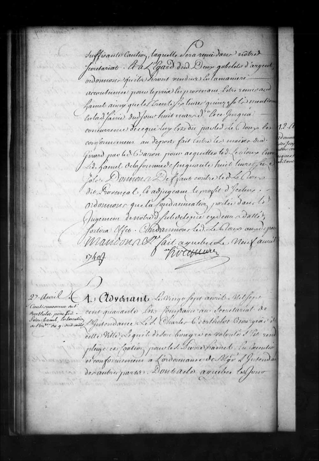 Cautionnement fourni par Charles Berthelot, négociant à Québec, en faveur de Pierre Hamel, habitant de Sainte-Foy, conformément à l'ordonnance de l'intendant Hocquart rendue entre ledit Hamel et Leroux dit Provençal, 27 avril 1740, Archives nationales à Québec, Fonds Intendants, (03Q,E1,S1,D28,P3219).