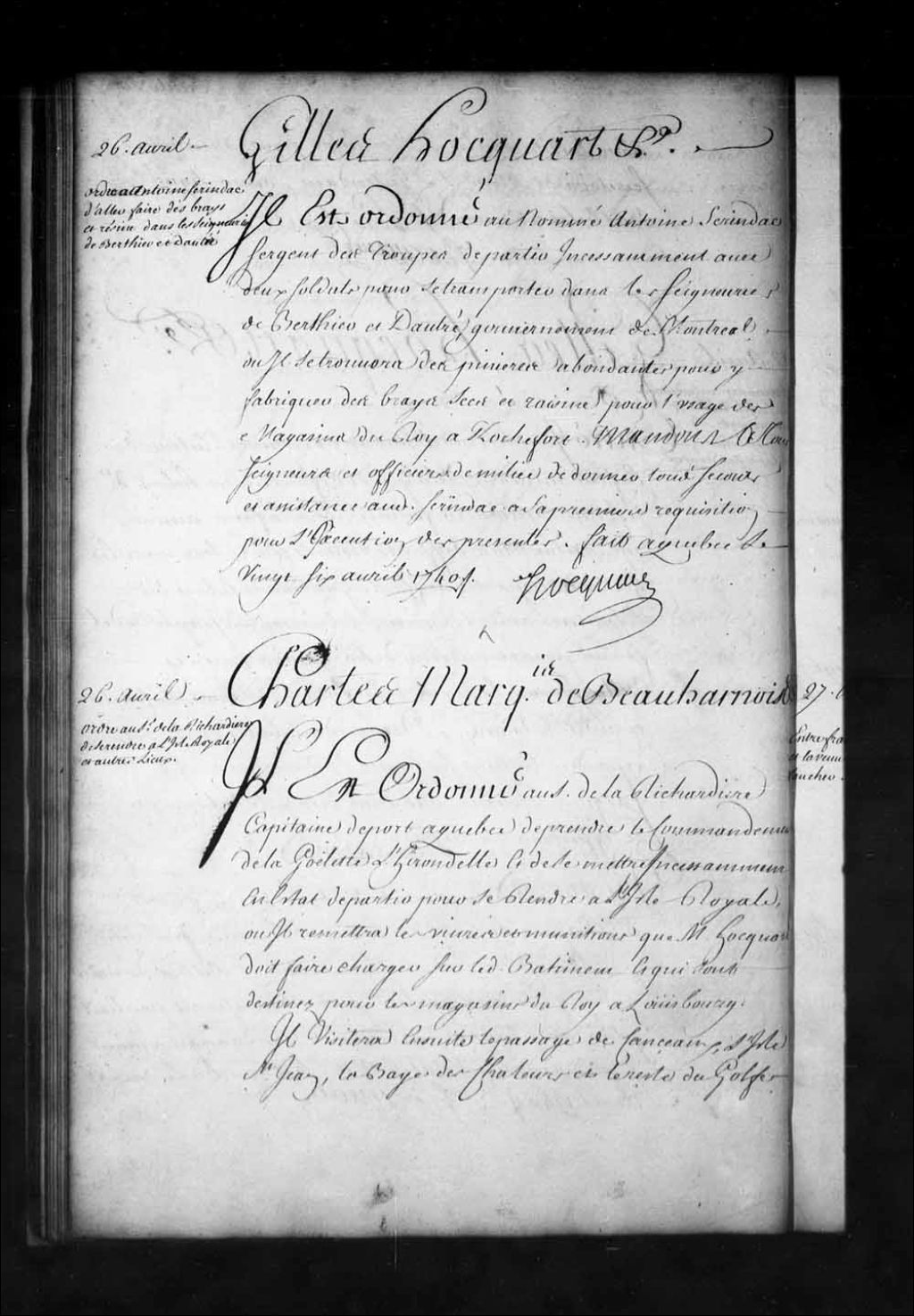 Ordonnance de l'intendant Hocquart qui commet le sieur de la Richardière (Testu), capitaine de port à Québec, pour prendre le commandement de la goélette (bateau) "l'Hirondelle" et se mettre incessamment en état de partir pour l'île Royale où il remettra les vivres et munitions que l'intendant destine aux magasins du Roi à Louisbourg; le sieur de la Richardière visitera ensuite le passage de Canseau, l'île Saint-Jean, la baie des Chaleurs et le reste du golfe qui n'a point été parcouru et il fera les observations nécessaires pour le perfectionnement de la navigation; les sieurs Pellegrin et Galocheau, pilotes du Roi, s'embarqueront avec le sieur de la Richardière et ils tiendront un journal exact de leur campagne, 26 avril 1740, Archives nationales à Québec, Fonds Intendants, (03Q,E1,S1,D28,P3222).