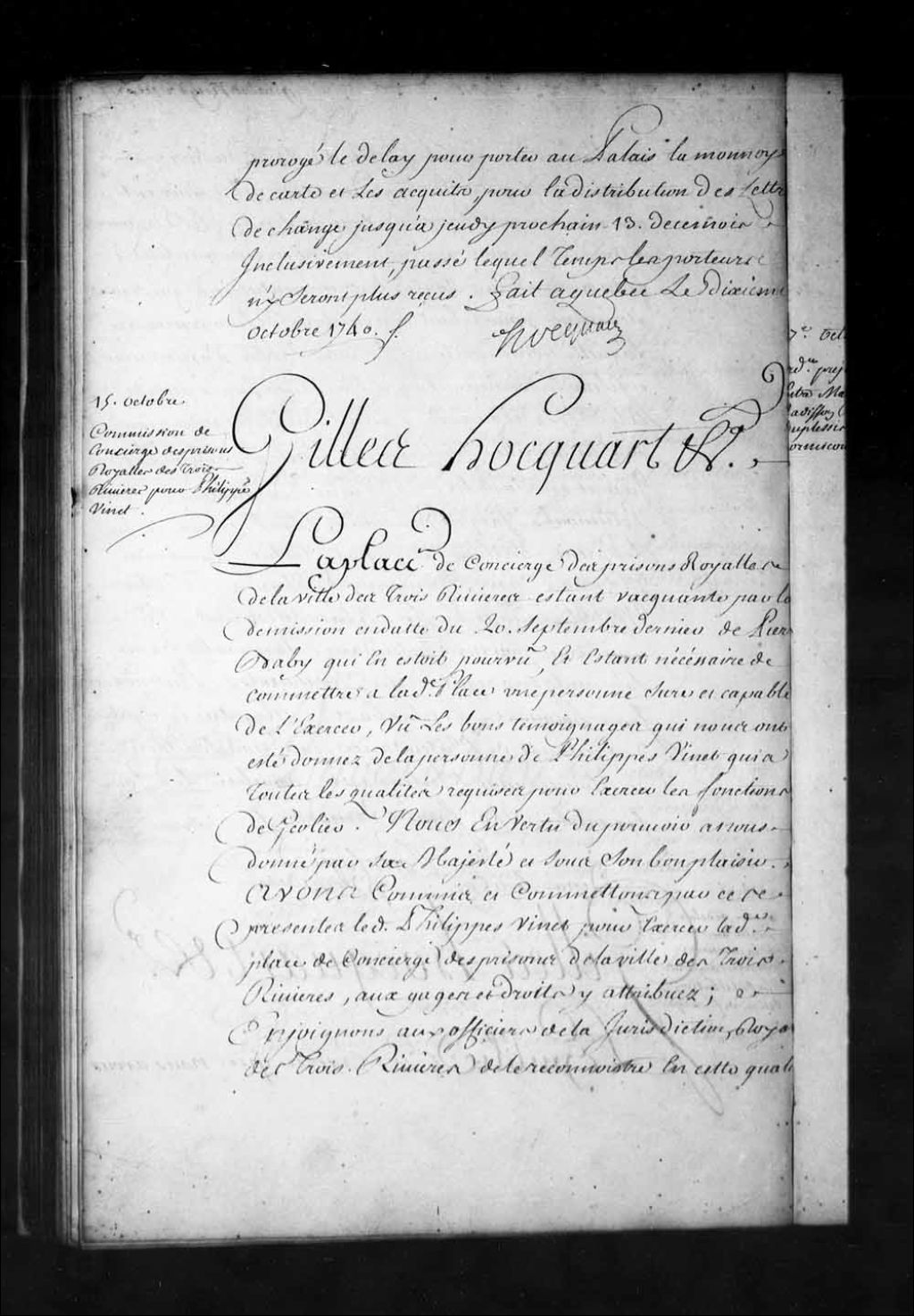 Commission de concierge des prisons royales des Trois-Rivières par l'intendant Hocquart pour Philippe Vinet, à la place de Pierre Baby (Babie), démissionnaire, 15 octobre 1740, Archives nationales à Québec, Fonds Intendants, (03Q,E1,S1,D28,P3279).