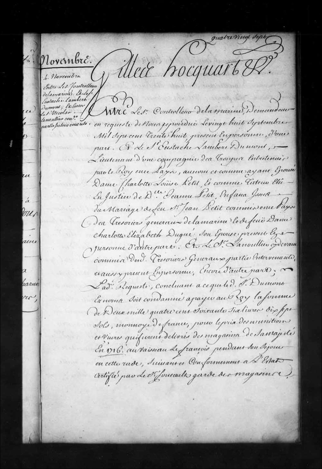 Ordonnance de l'intendant Hocquart entre le contrôleur de la Marine, Eustache Lambert Dumont, lieutenant d'une compagnie des troupes de la Marine, et Nicolas Lanoullier (Lanouiller), ci-devant trésorier de la Marine, au sujet des munitions et vivres délivrés des magasins de Sa Majesté en 1716 au vaisseau "le François", 4 novembre 1740, Archives nationales à Québec, Fonds Intendants, (03Q,E1,S1,D28,P3284).
