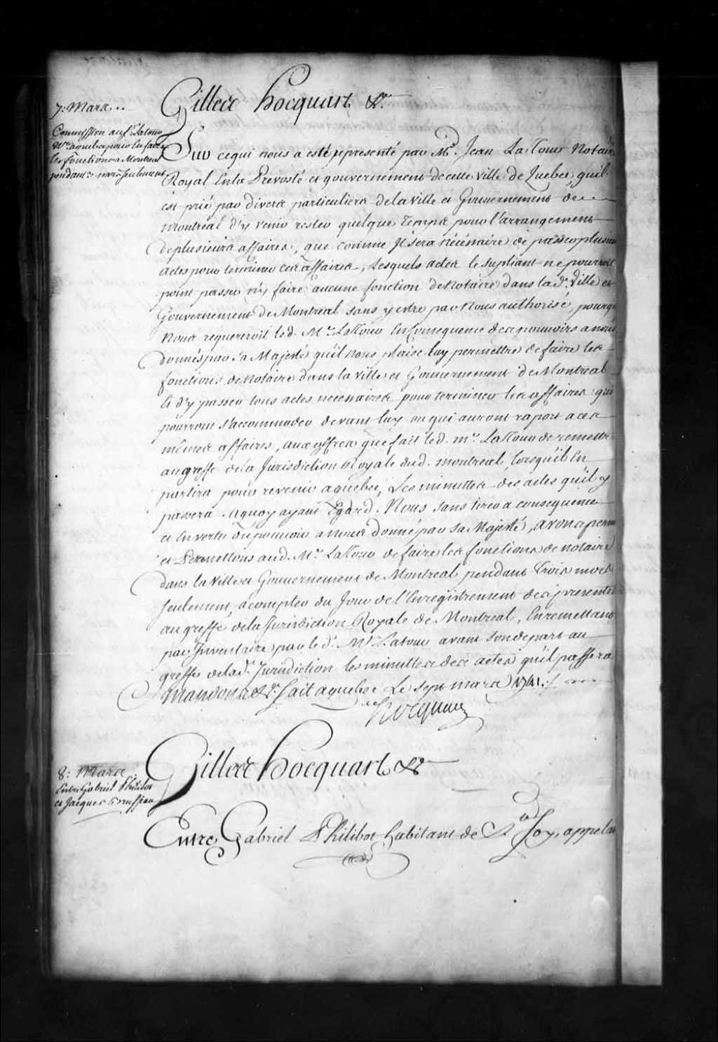 Commission à Jean Latour, notaire royal en la Prévôté de Québec, par l'intendant Hocquart pour faire les fonctions de notaire dans la ville et gouvernement de Montréal pendant trois mois seulement pour l'arrangement de plusieurs affaires qu'il a en mains; ledit Latour devra laisser au greffe de la Juridiction royale de Montréal les minutes des actes qu'il passera pendant son séjour dans cette ville